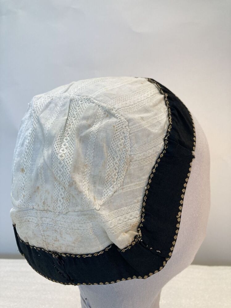 Tussenmuts van katoenen Marseille afgezet met zwartzijden stippeltjesband