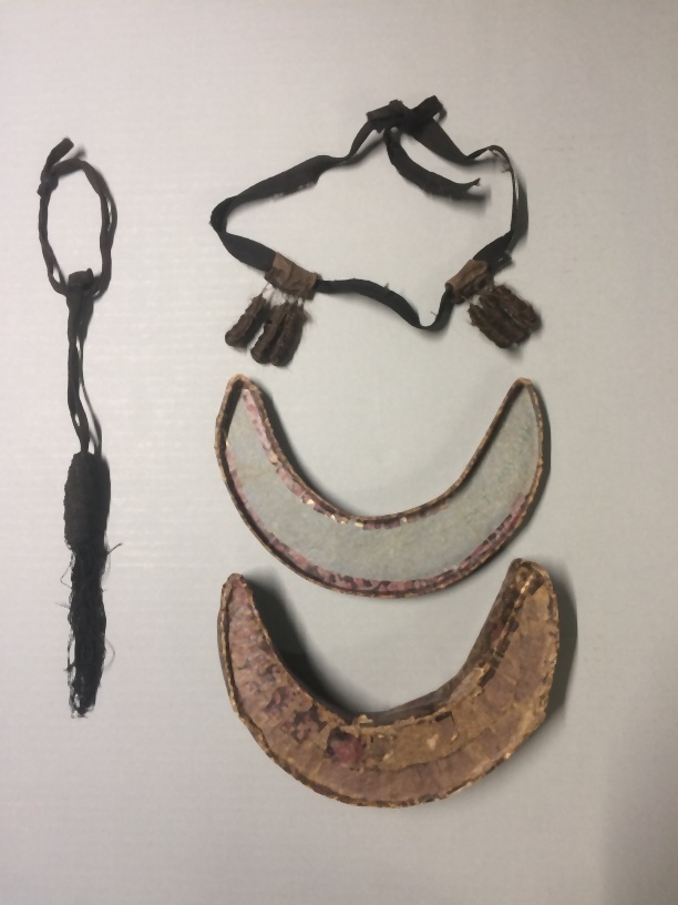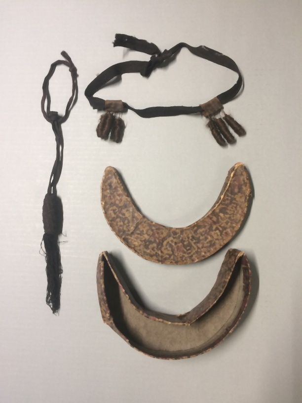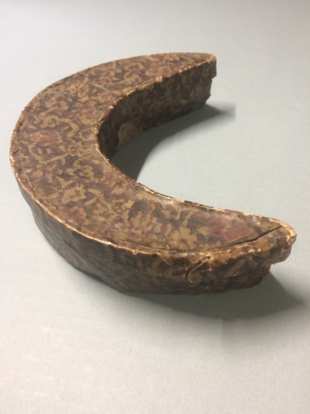 Halve maanvormig doosje met daarin valse krullen of toertjes van Ameland en een kwast aan lint