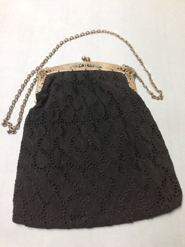 Zilveren tasbeugel met ajour Jugendstil motief aan ketting, met tas van zwart broderie