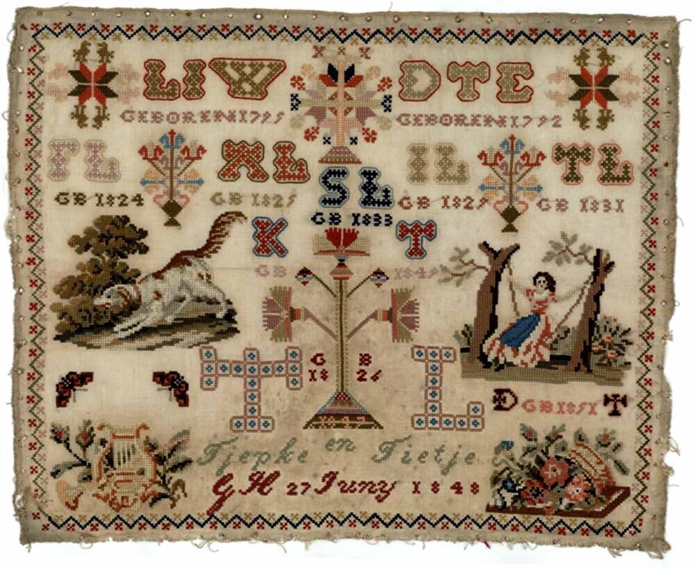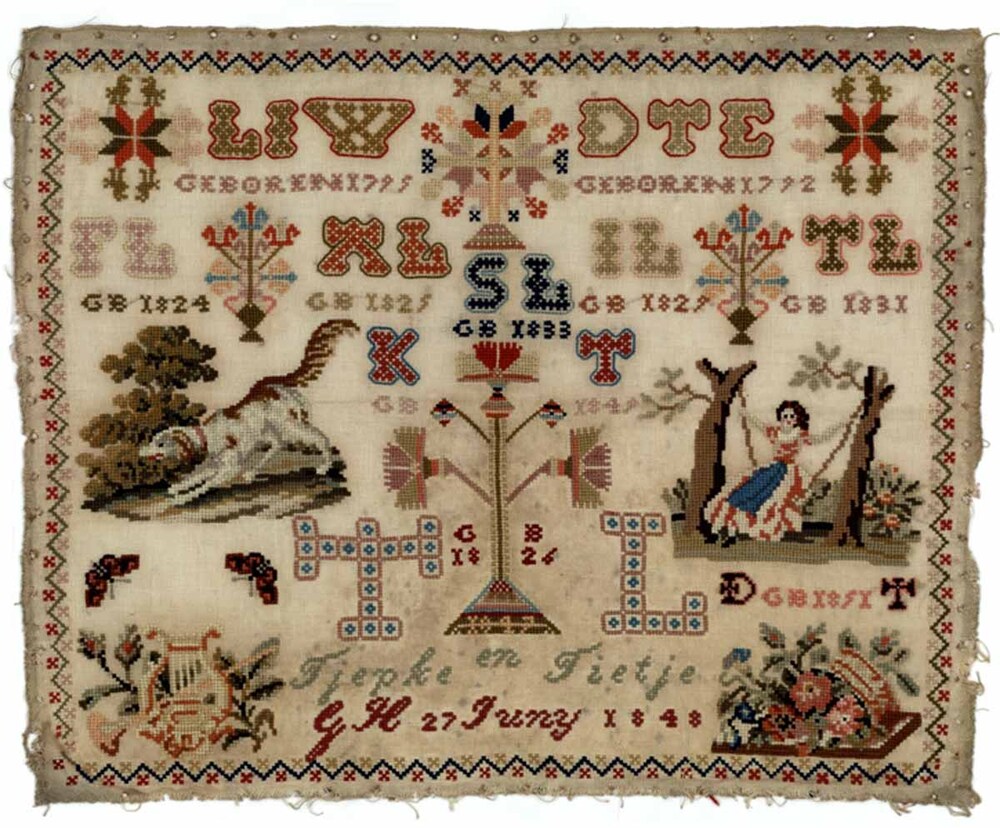 Textielwerken, meestal van fijne stof, waarop door vrouwen en meisjes in verschillende steken is geborduurd en die bedoeld zijn om in te lijsten. Ze werden doorgaans gemaakt door beginnelingen om hun vaardigheden te tonen. Kenmerkend zijn een combinatie van steken, motieven, letters en verzen, en vaak de voltooiingsdatum en de naam van de borduurster. (AAT-Ned)
