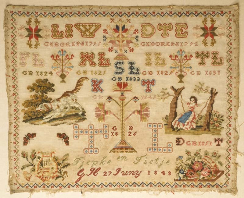 Merklap met meisje op schommel, gemerkt T.L. 1847-1851