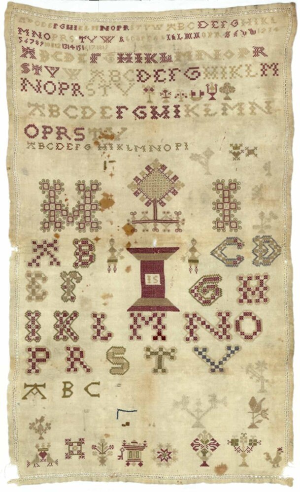 Lettermerklap met open zoom, onaf, met garenklosmotief, gemerkt H.I. , ongedateerd