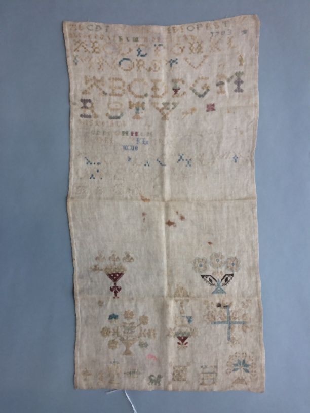 Lettermerklap in gedempte tinten met negen alfabetten, gemerkt Hiske Alb., 1703, onderdeel van groep van vier