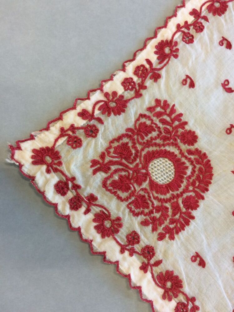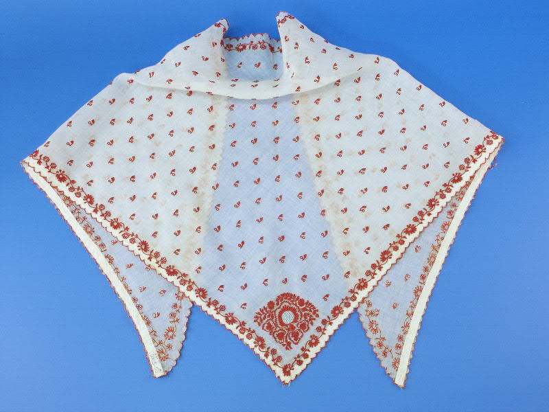 Tipdoek of fichu bij het Fries Kostuum, met rood getamboereerd neteldoek en wit getamboereerde tule, onderdeel van groep van twee