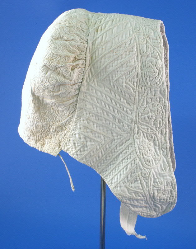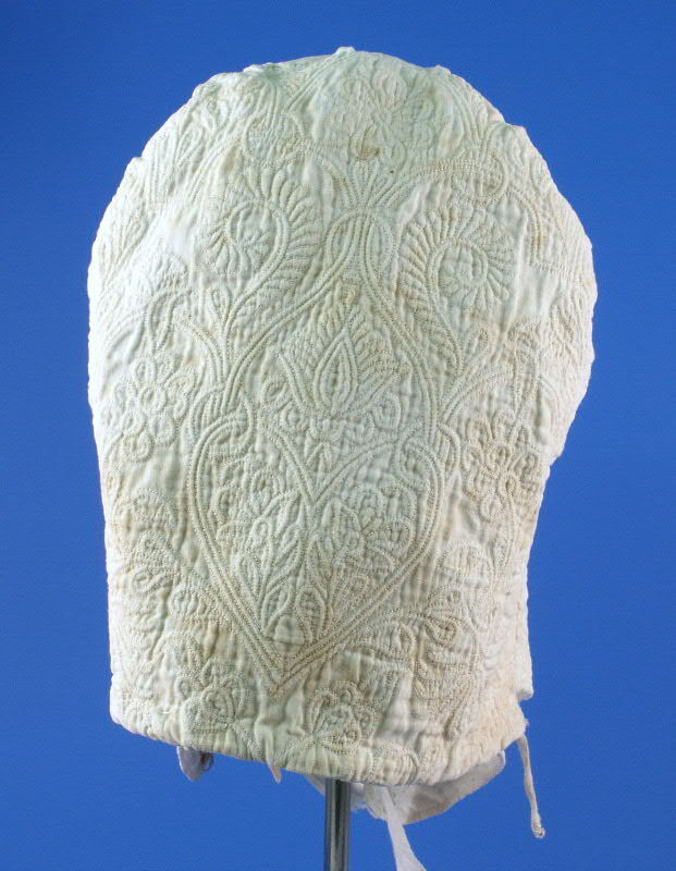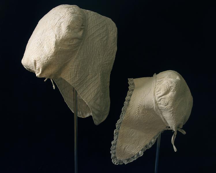 Marseilles, geborduurde vrouwenmuts met lange voorstrook die neerhangt langs de kin