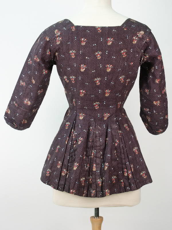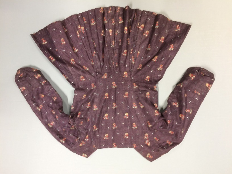 Vrouwenjak van paarsbedrukt katoen met strooimotiefjes, met uitlopende schoot