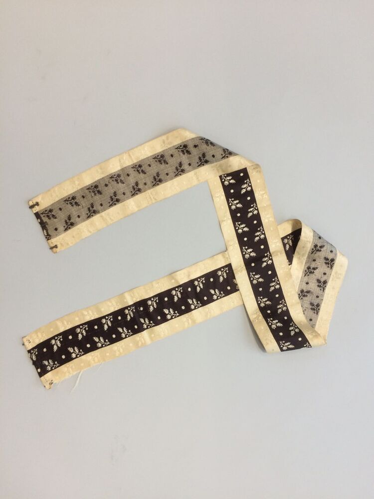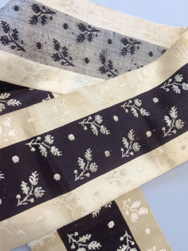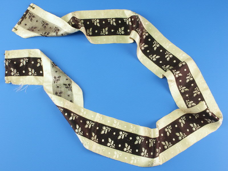 Zijden zonhoedlint voor de rouw, creme met bruinzwarte middenbaan en ingeweven bloemetjes