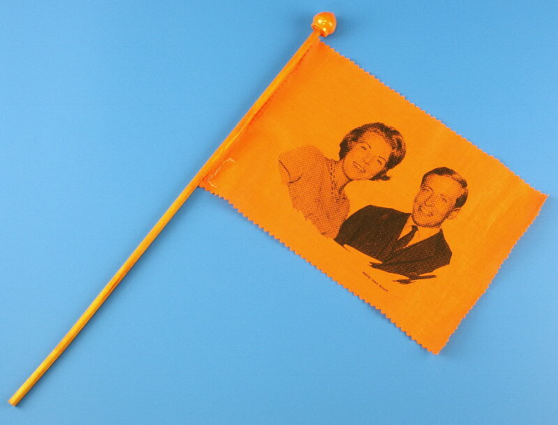 Stok met vlaggetje met portret van prinses Beatrix en prins Claus