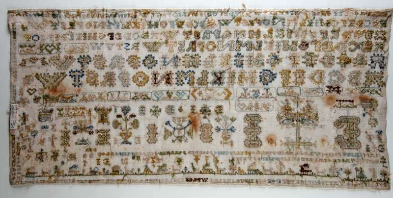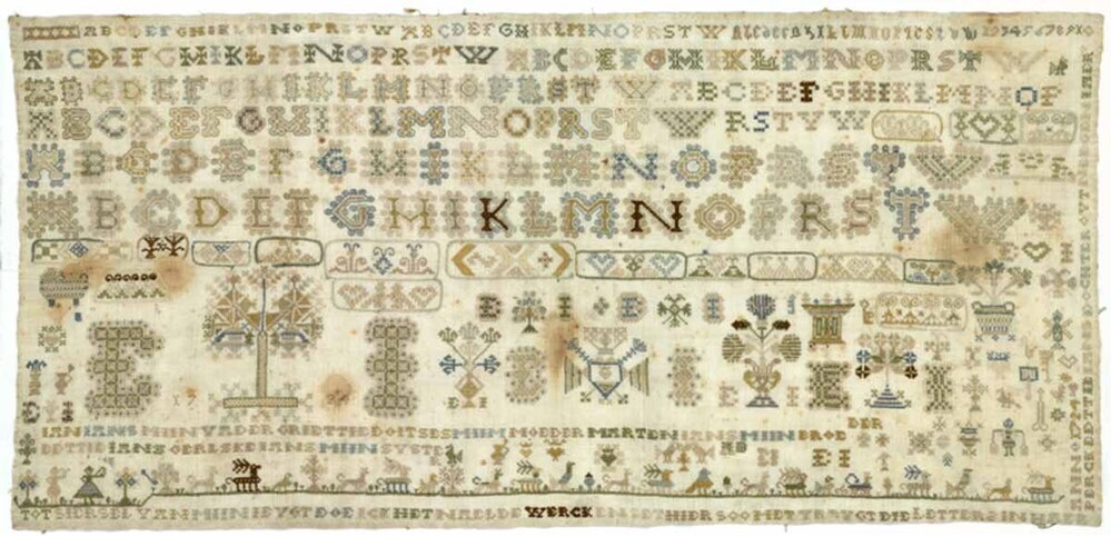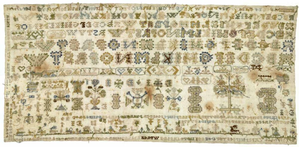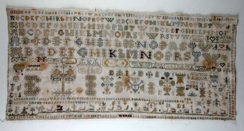 Merkletterlap, met hemdsboordranden in kaders, grondje en tekst, gemerkt E.I. 1724