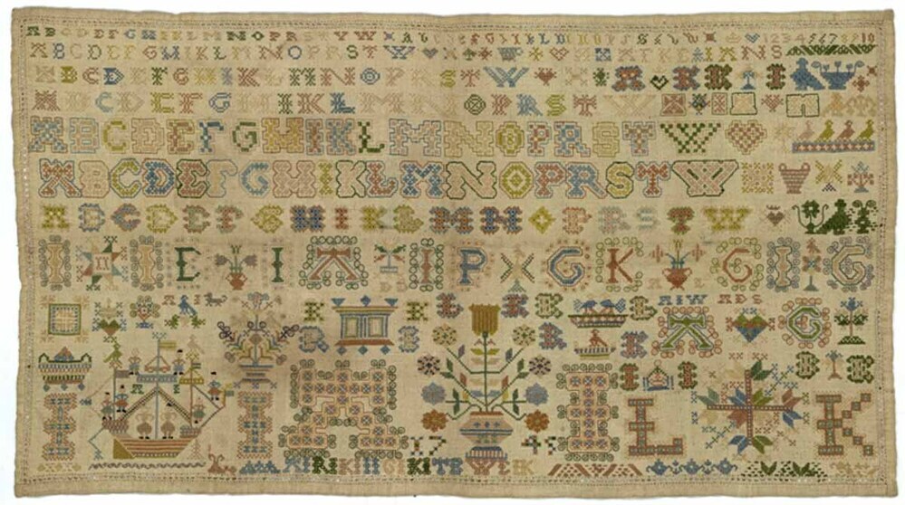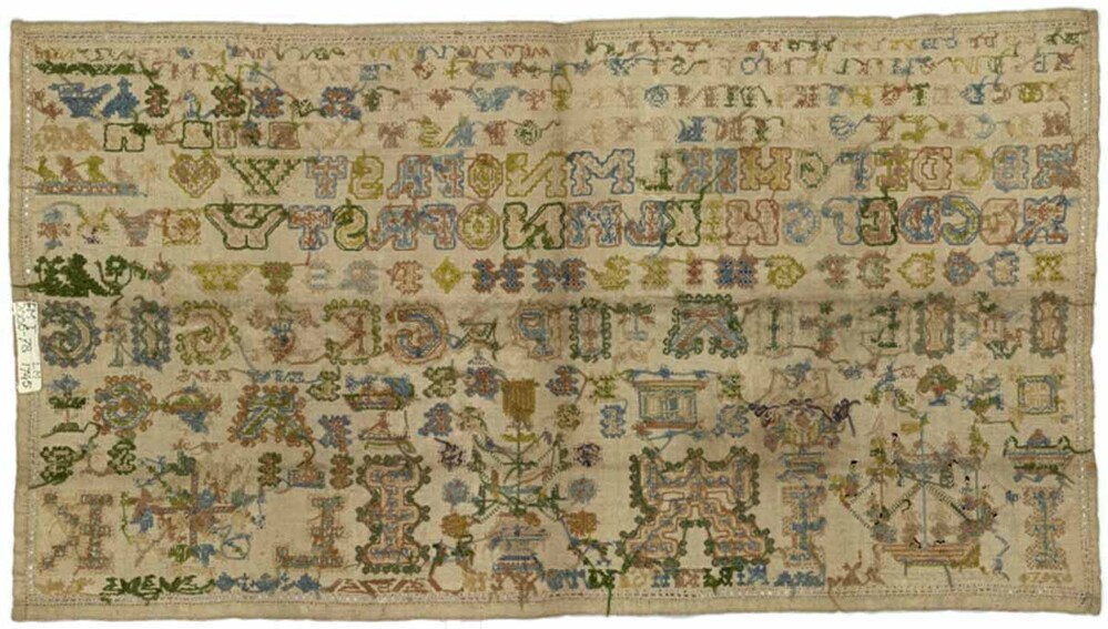 lettermerklap met open zomen, veelkleurig, gemaakt door Afke Jans, gemerkt A.I. 1745
