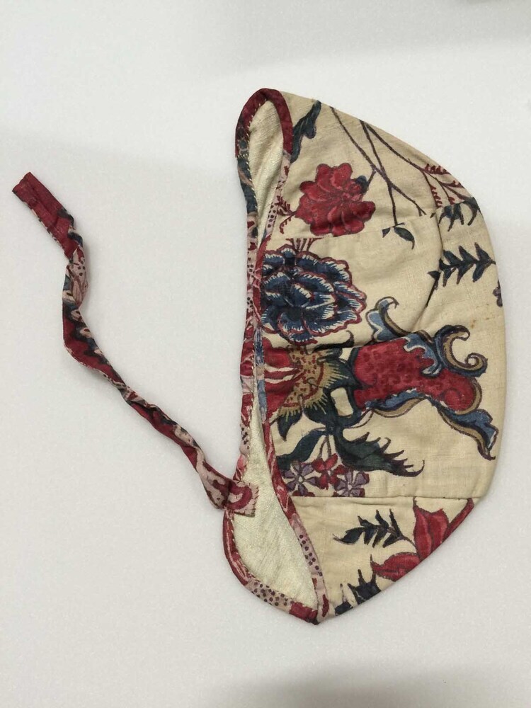 Meisjesmuts van beschilderde Indiase sits, witte grond met bloemranken en hoorn des overvloeds met bloemen, rondom afgewerkt met ander sits