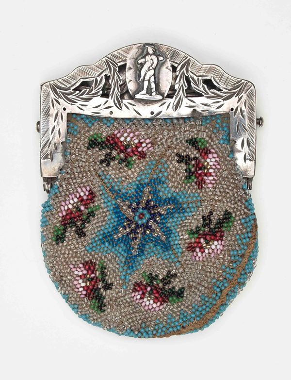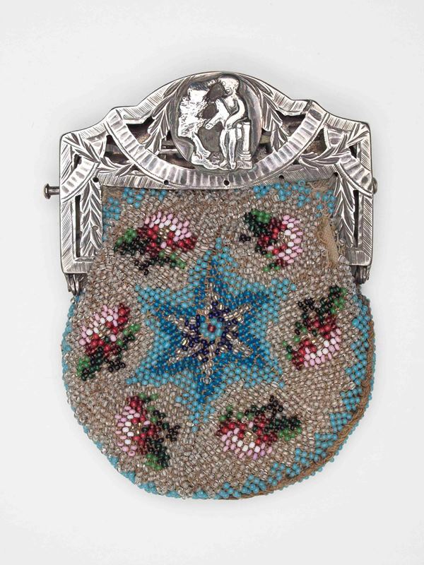 Zilveren empire beugelbeurs, met tasje van kralenbreiwerk, afkomstig van Tjitske van der Wal