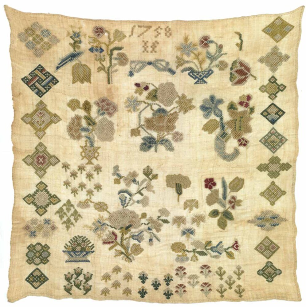 Proeflap in rococoborduurwerk, gemerkt I.F., 1758