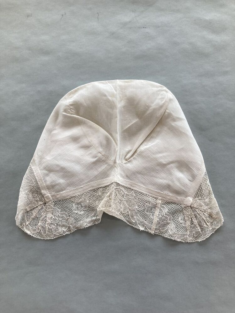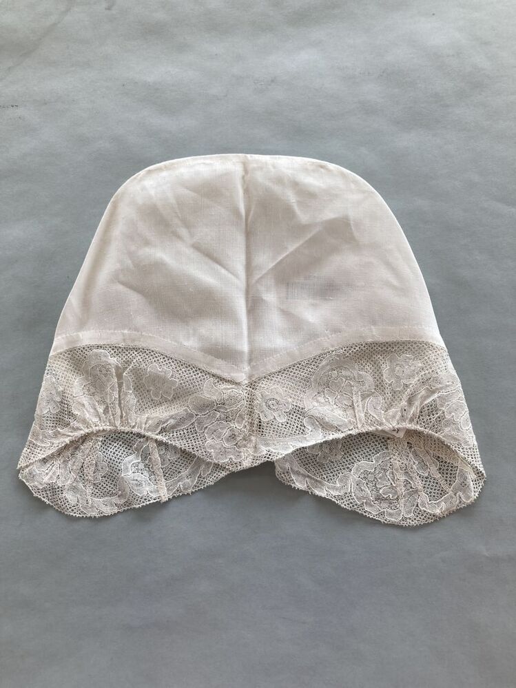 Tipmuts met strook van trollekant met Hollands kloskant motief met kontoerdraad