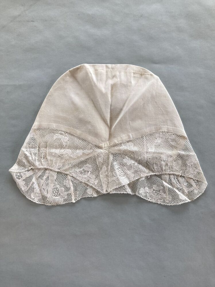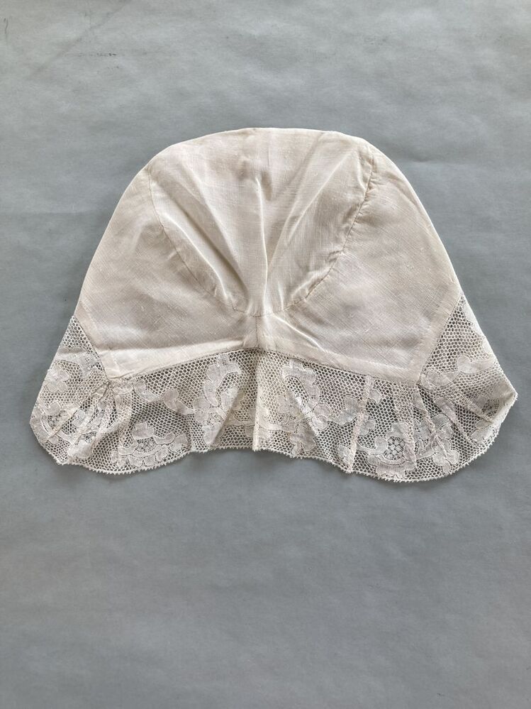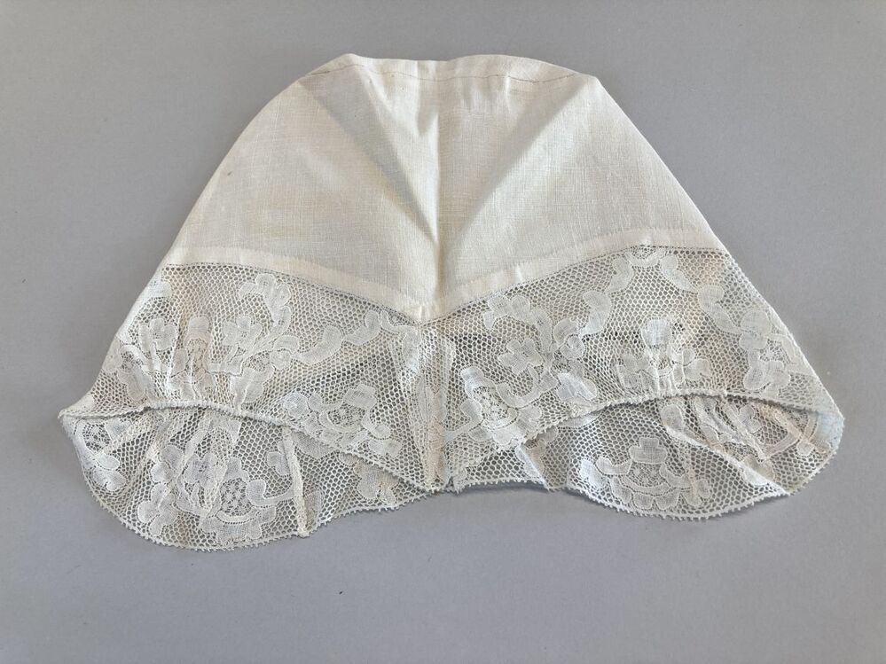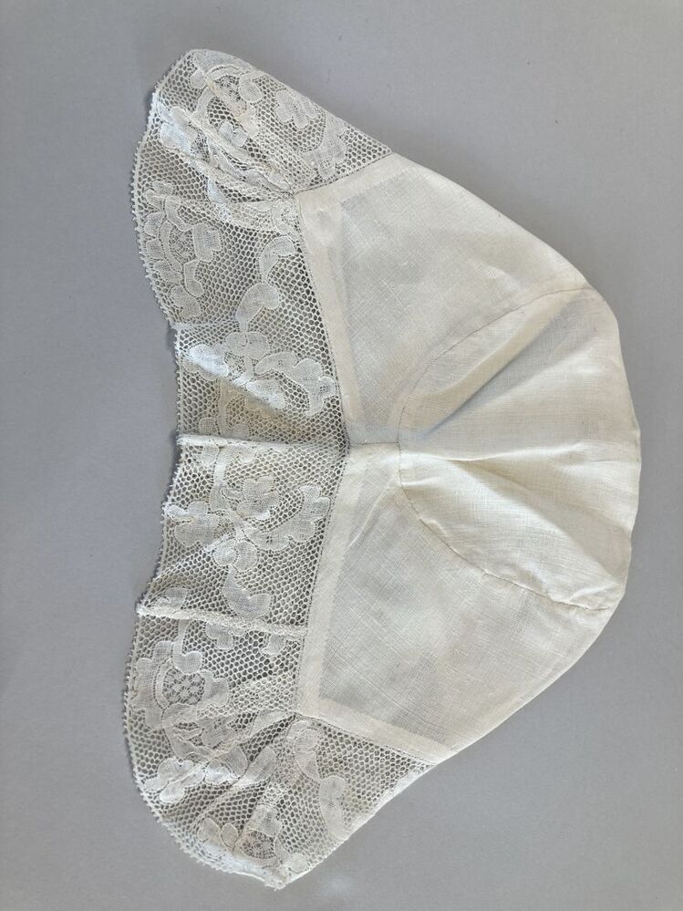 Tipmuts met kloskant strook met symmetrisch floraal motief op Valenciennes grond