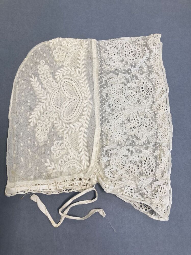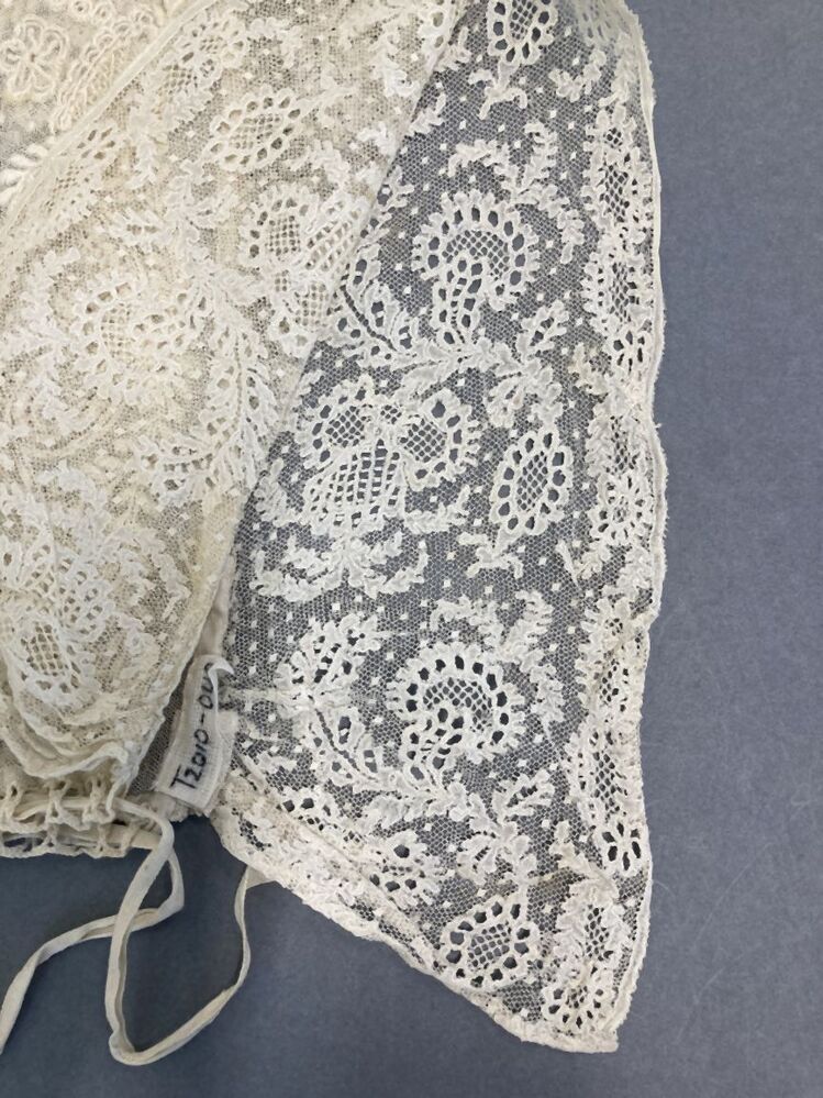 muts met geborduurde bol afgezet met brede strook Rijssels kloskant