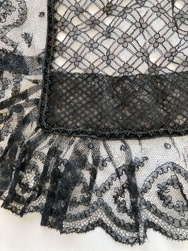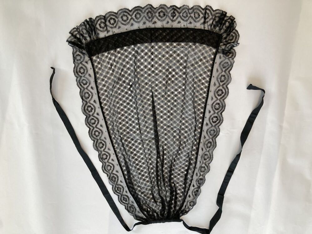 Rouwschort van zwarte machinale kant met kraaltjes.