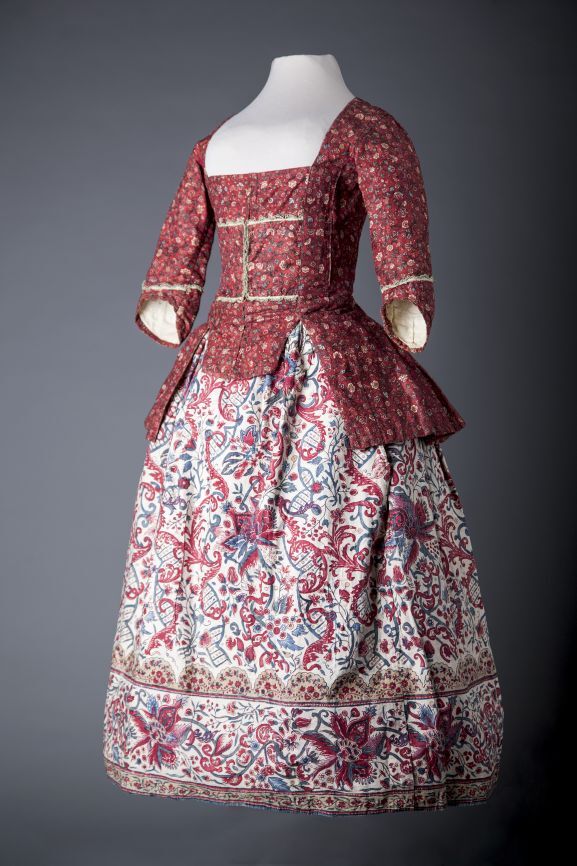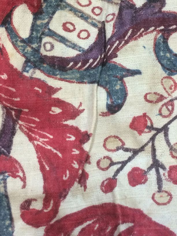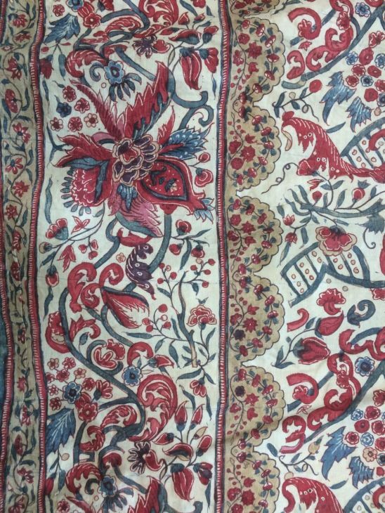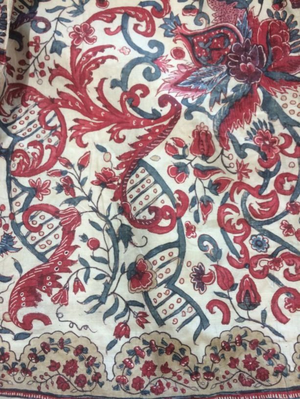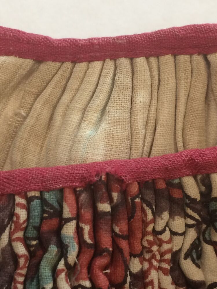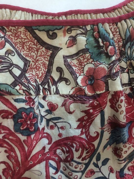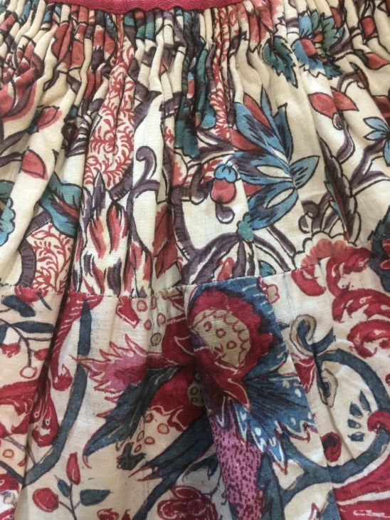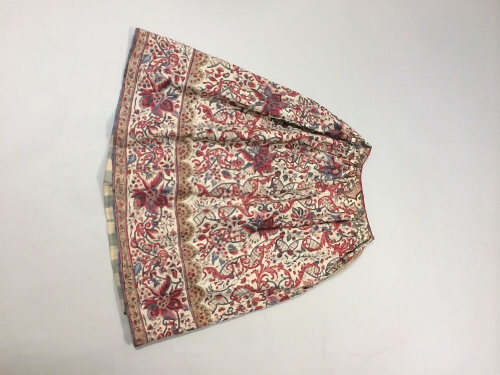 Meisjesrokje van handbeschilderde Indiase sits met geschulpte rand met bloemranken op witte grond.