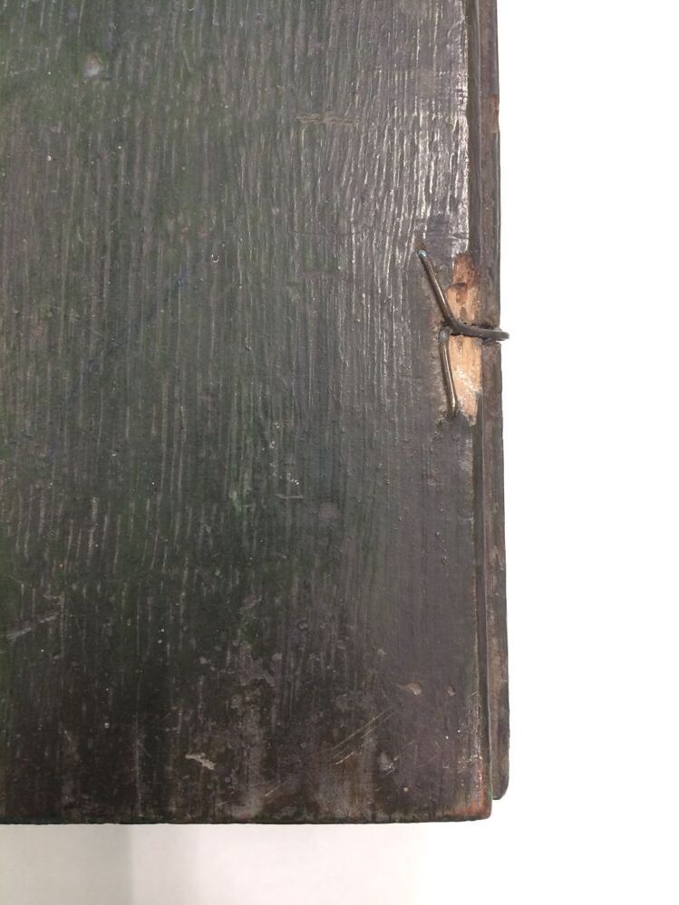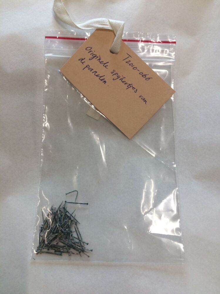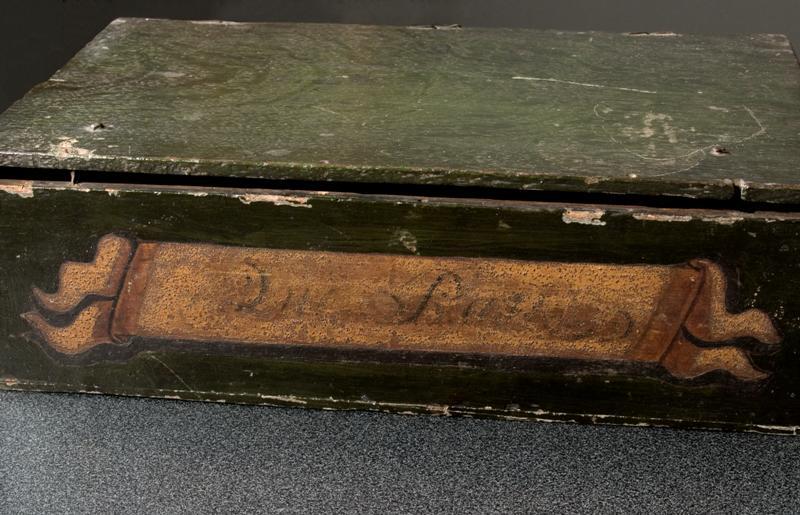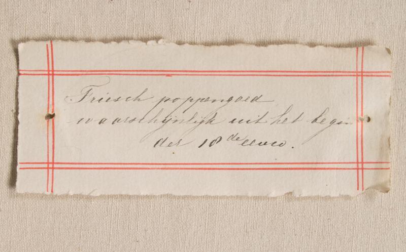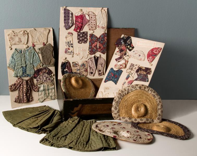 Eikenhouten kistje waarin zes panelen met 18de-eeuwse poppenkleding