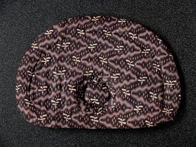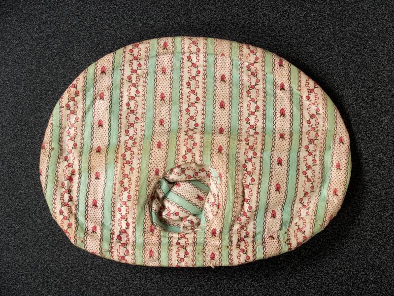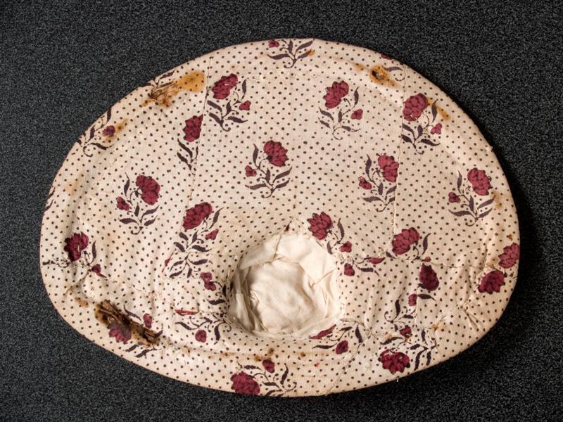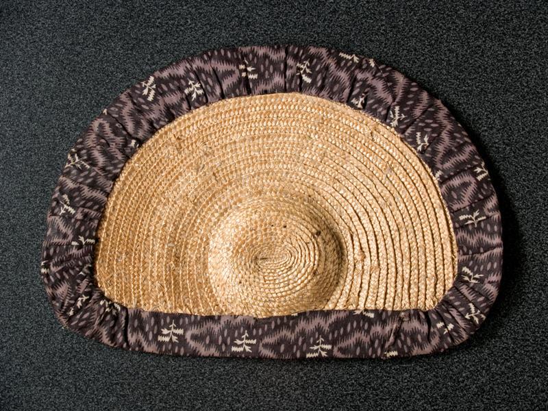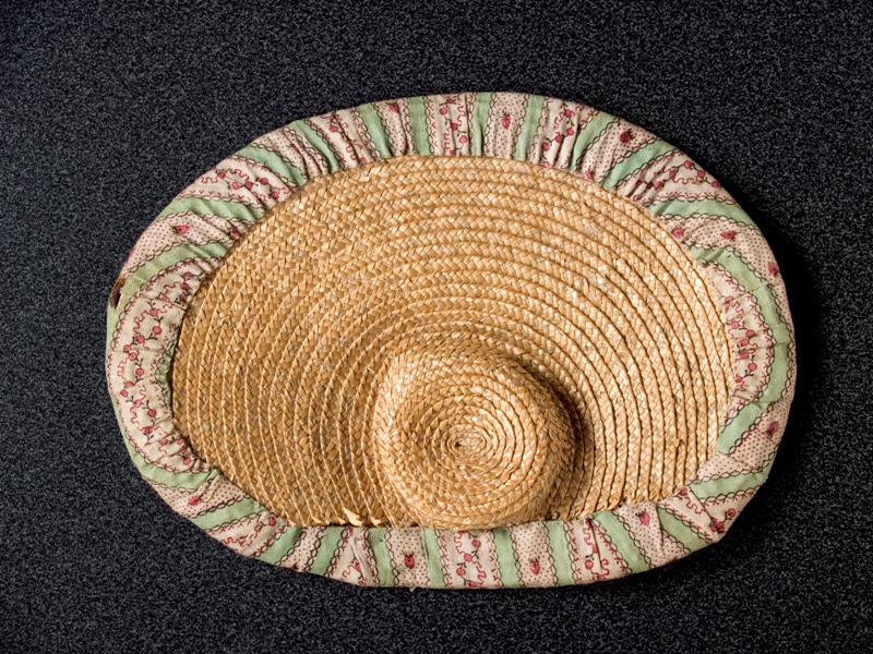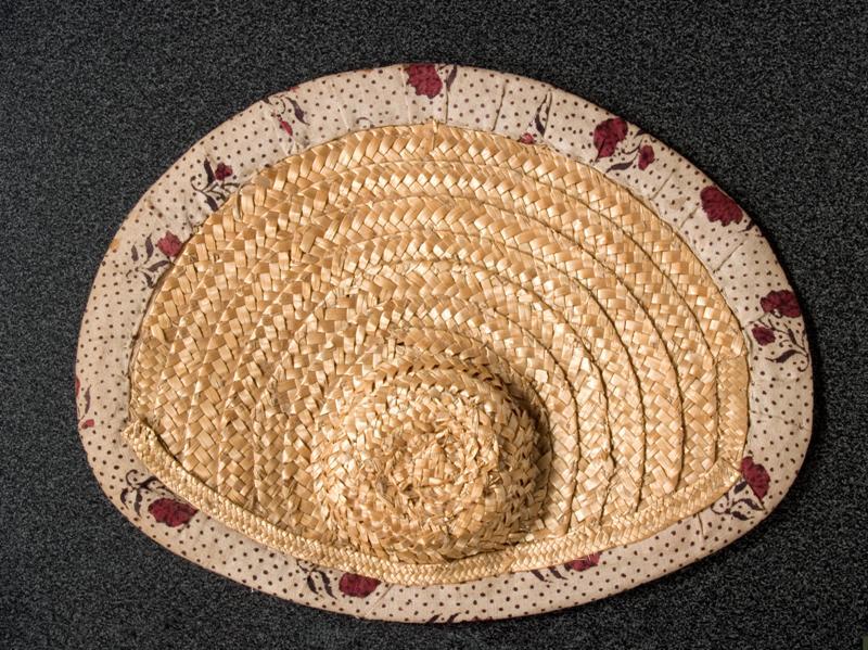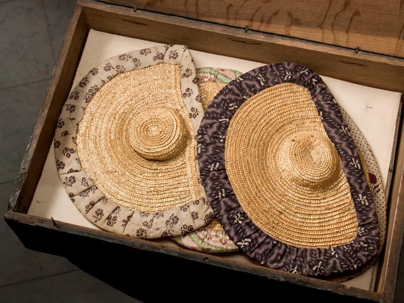 Paneel met zonnehoeden uit eikenhouten kistje waarin zes panelen met 18de-eeuwse poppenkleding
