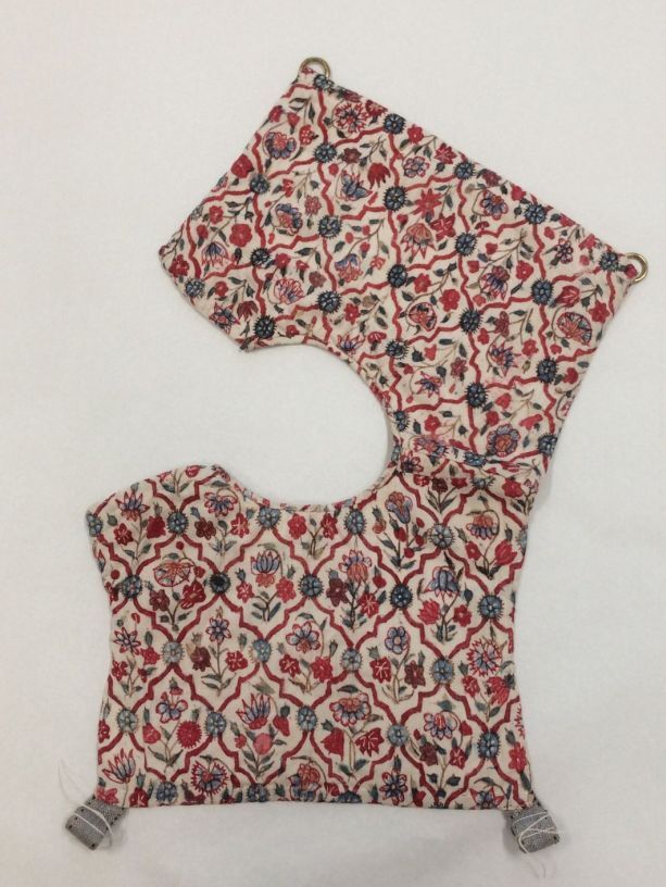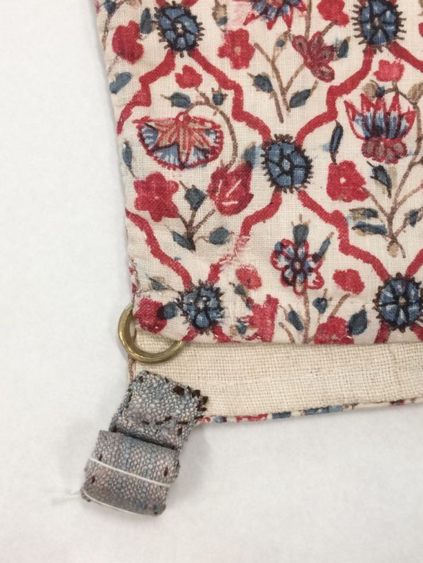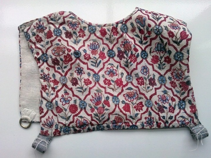 Kinderkroplap voor meisje van sits met diagonaal tegelpatroon gevuld met verschillende bloemmotieven op witte grond