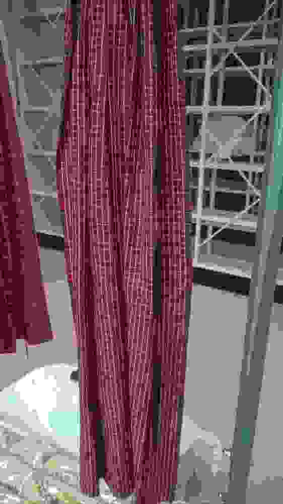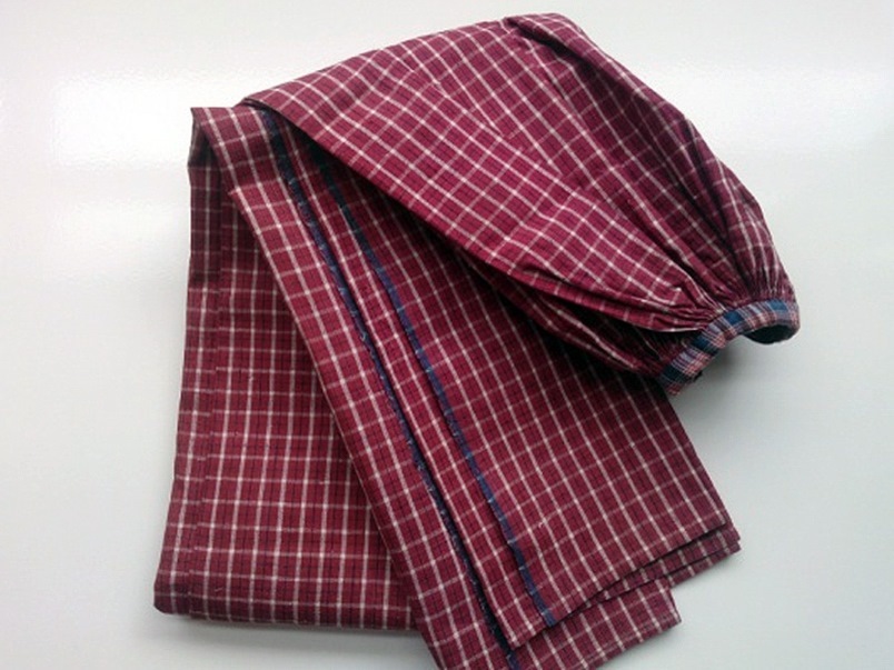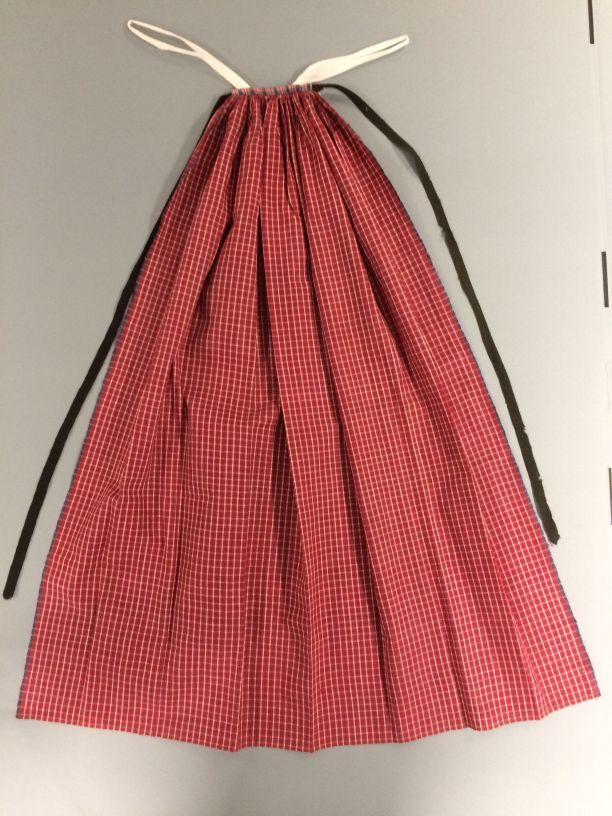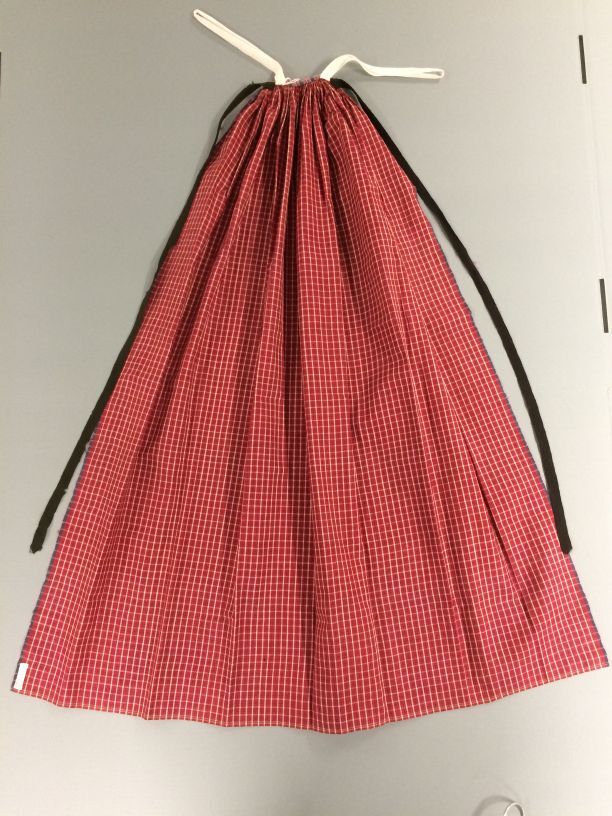 Bonte schort van katoen uit India, smal gerimpeld in de taille, met zwart wollen banden