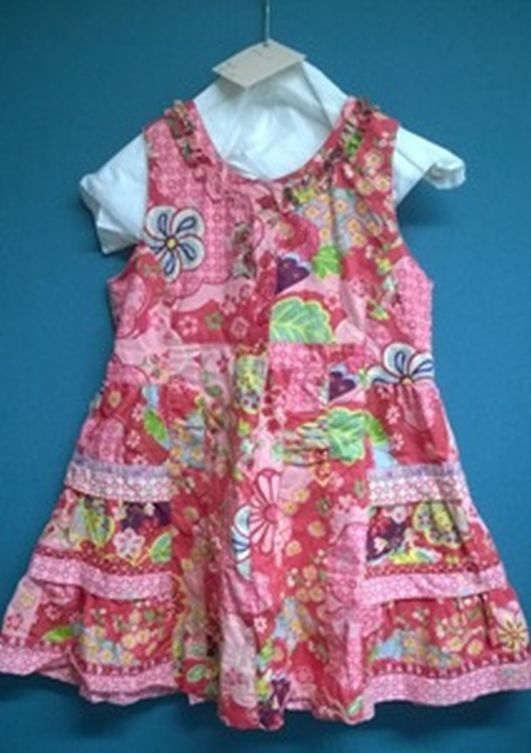 Rood-roze gebloemde katoenen meisjesjurk zonder mouwen, strokenrok met banen van verschillende gebloemde stoffen.