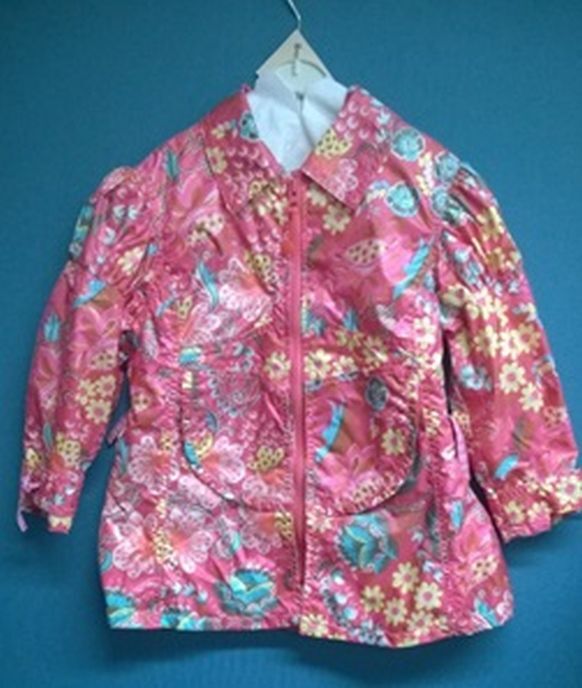 Roze gebloemde gladde regenjas voor meisje met kopmouwtjes en opgezette zakken, versierd met ruches
