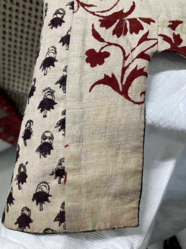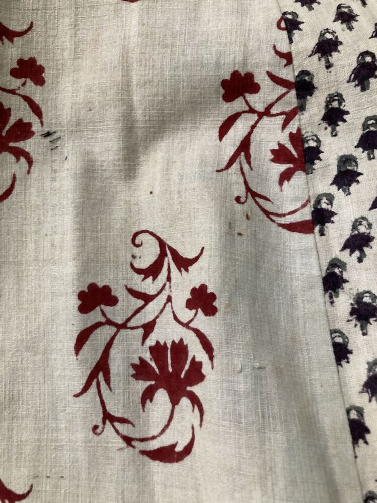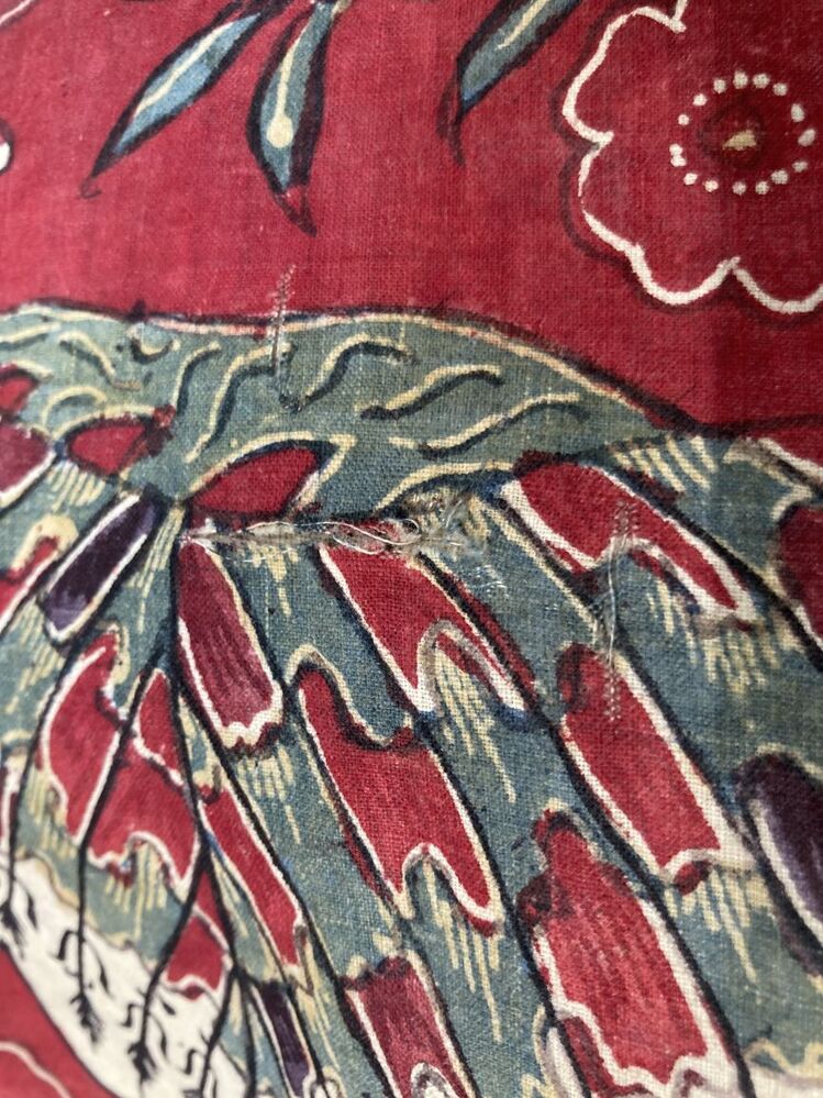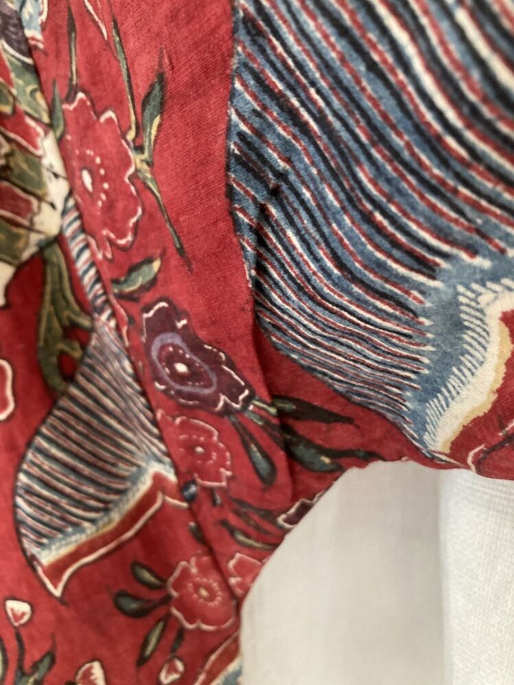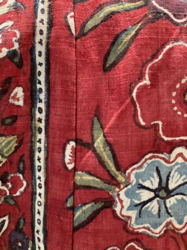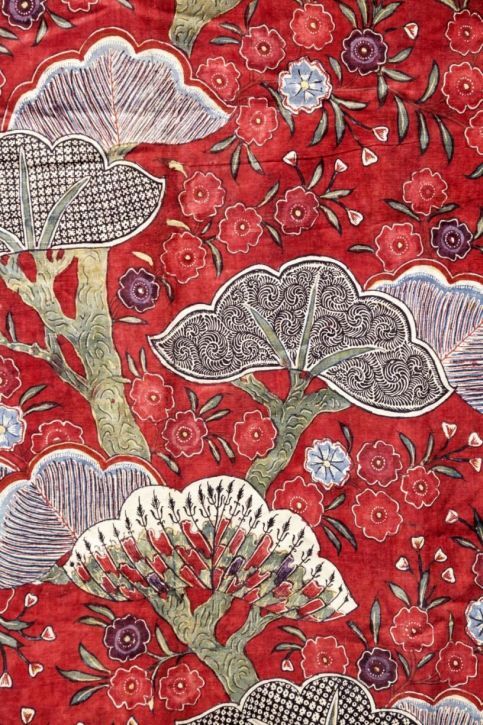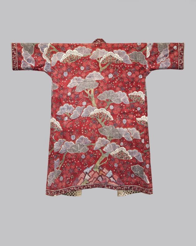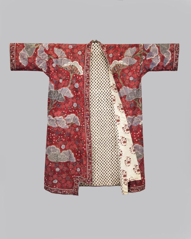Japonse rok van Indiase sits in kimonovorm, beschilderd met prunus en pijnboommotief op rode grond, gevoerd met twee soorten eenvoudige bedrukte Indiase katoen