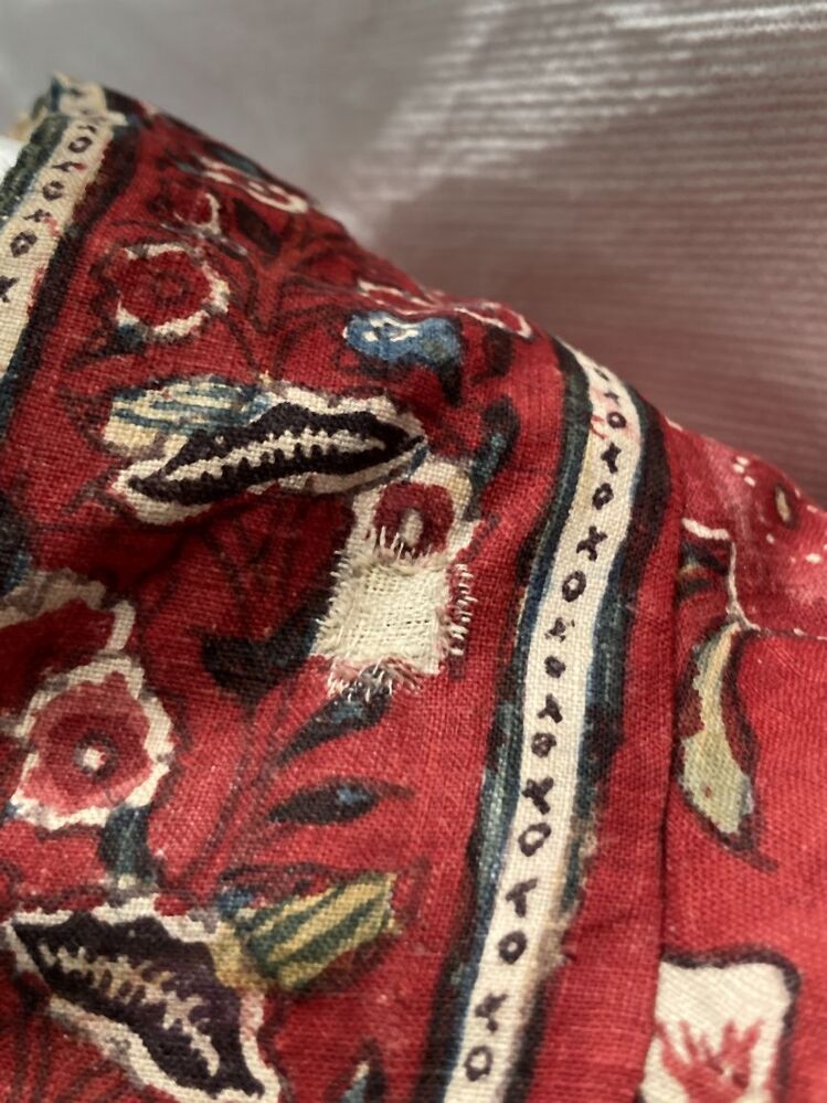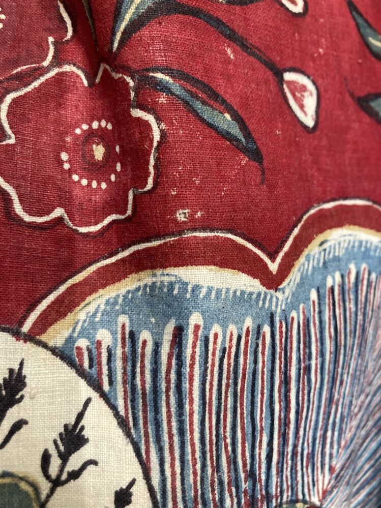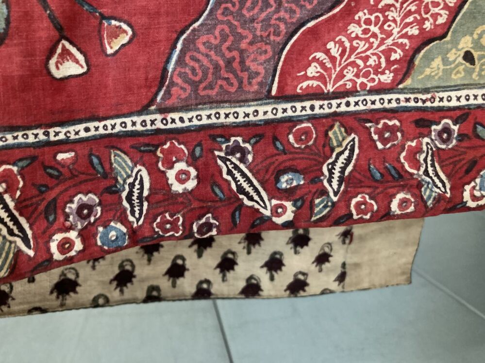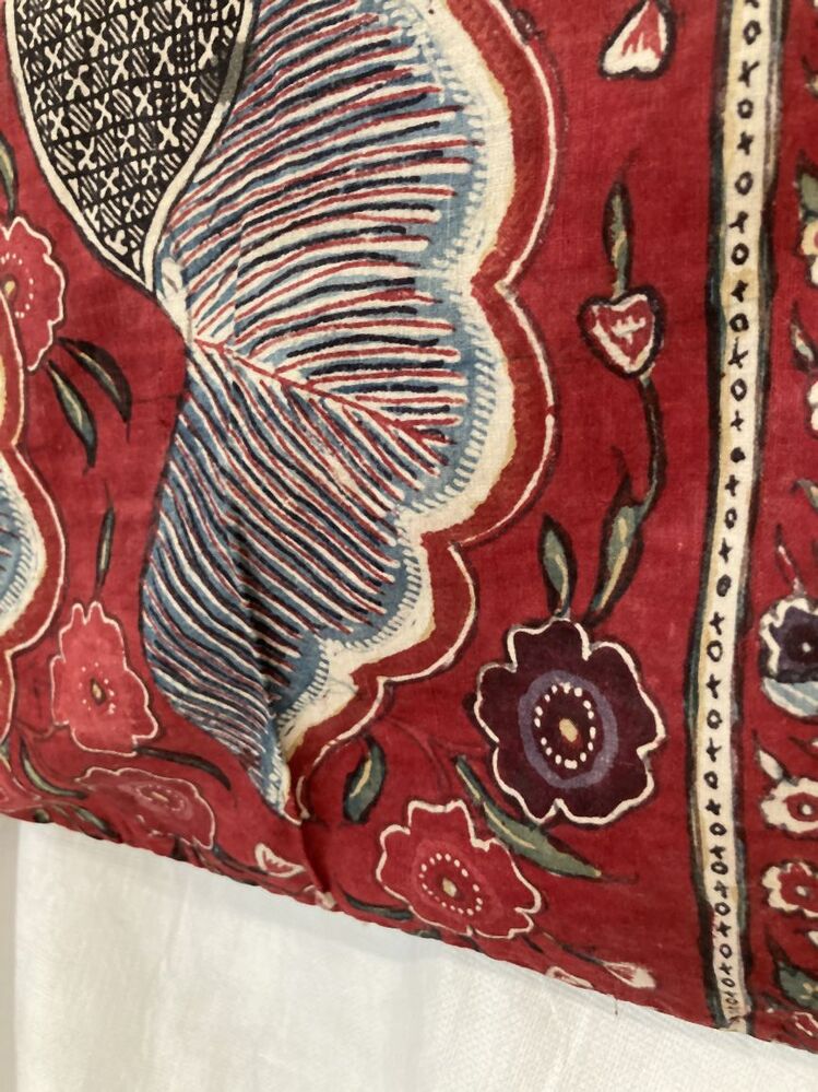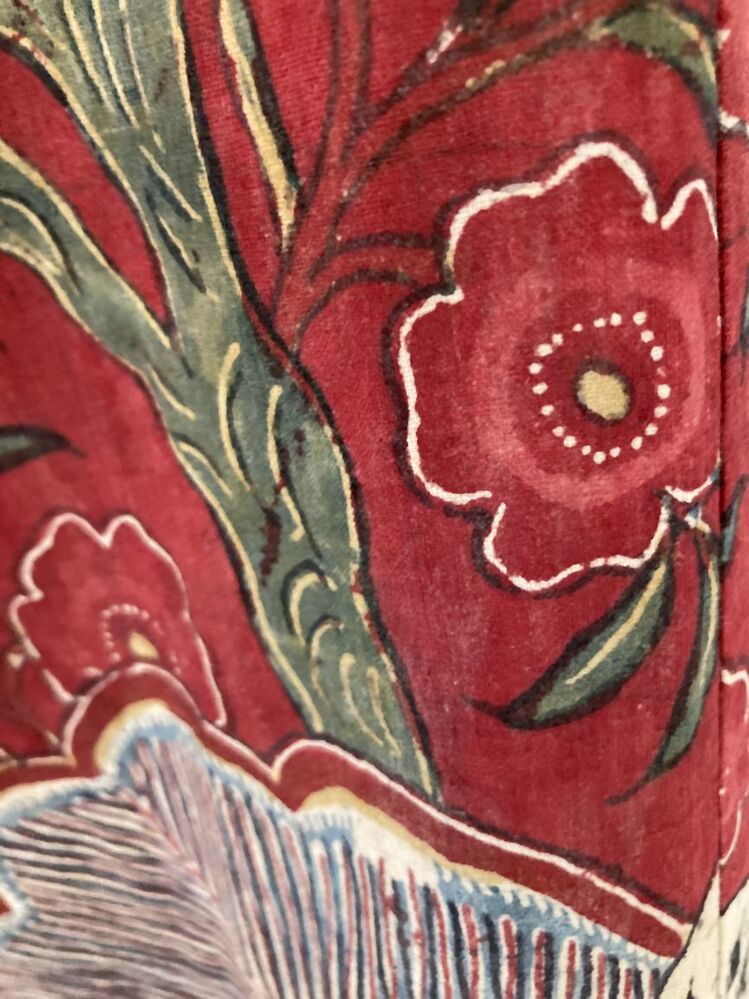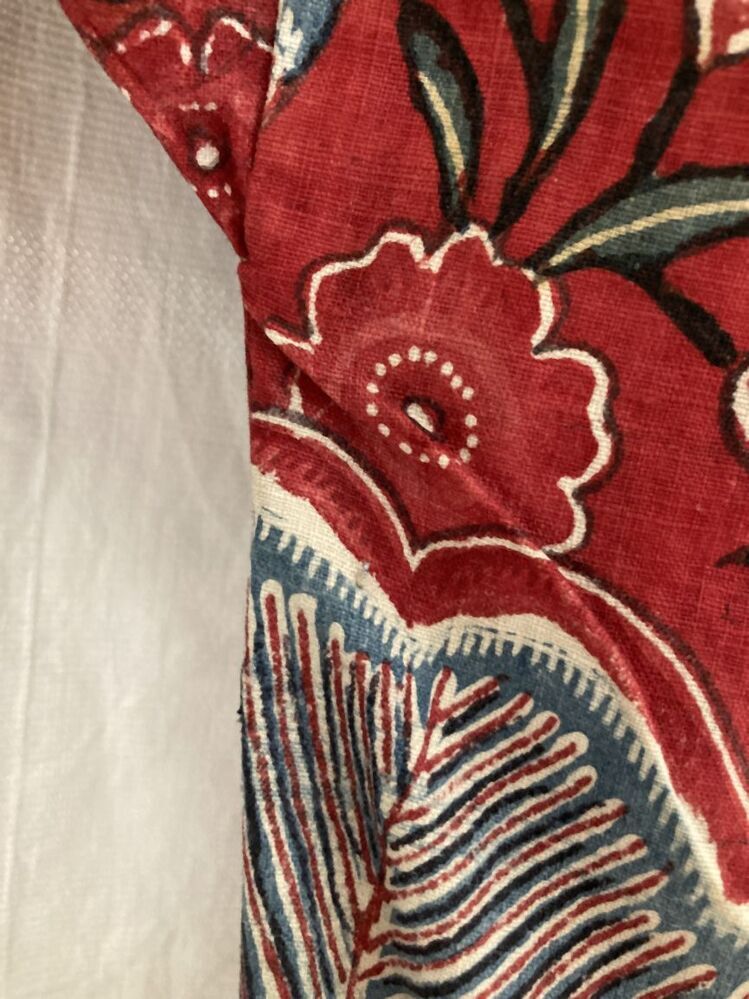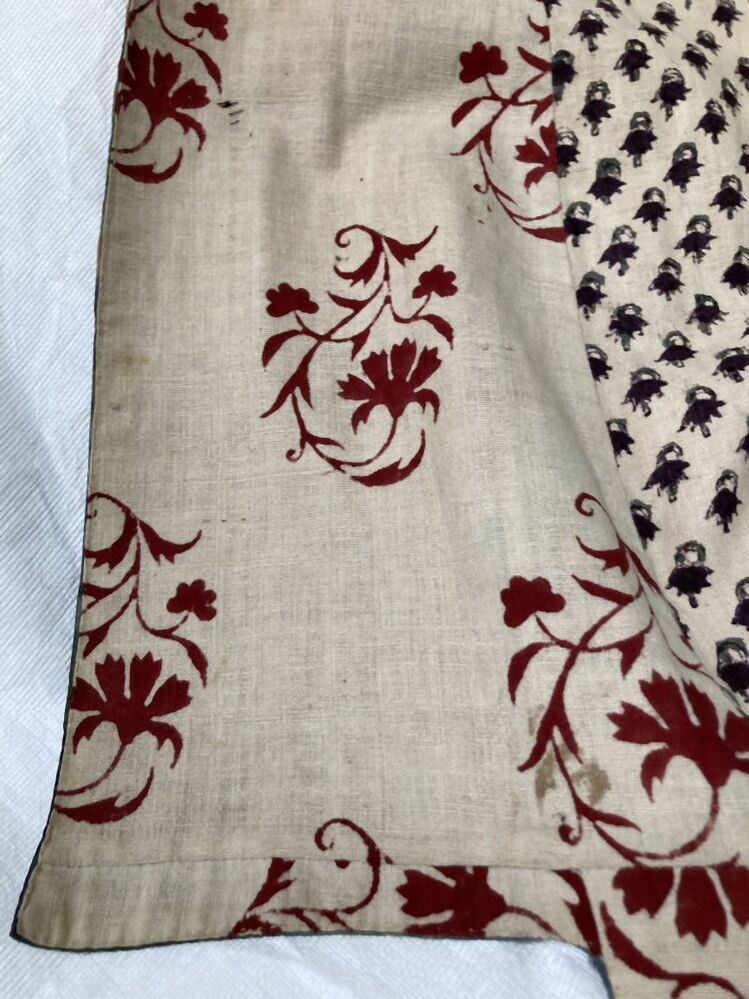 Japonse rok van Indiase sits in kimonovorm, beschilderd met prunus en pijnboommotief op rode grond, gevoerd met twee soorten eenvoudige bedrukte Indiase katoen