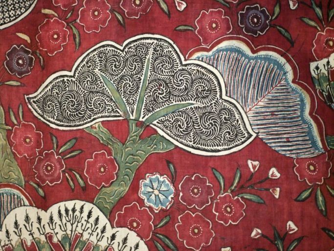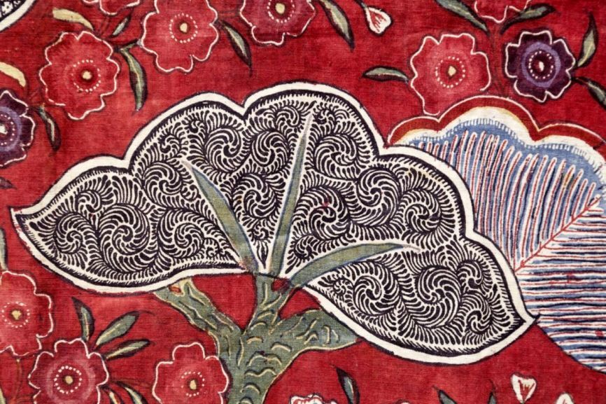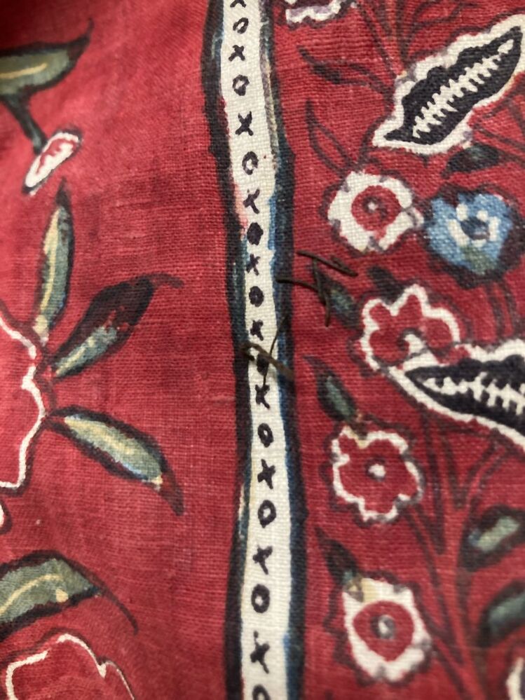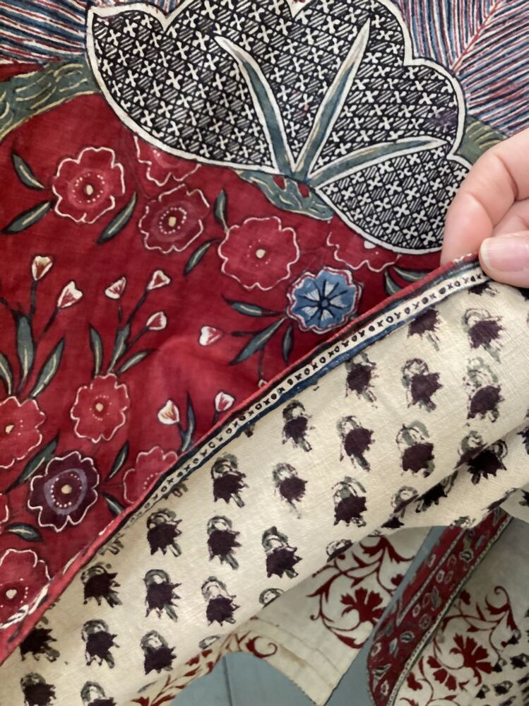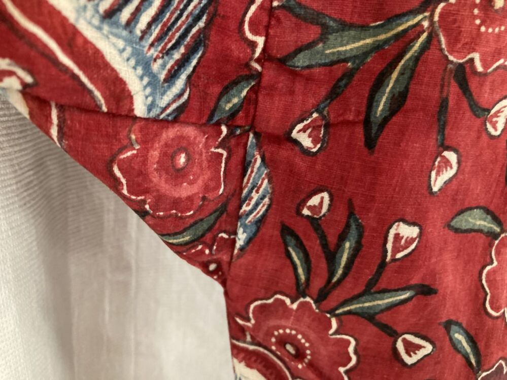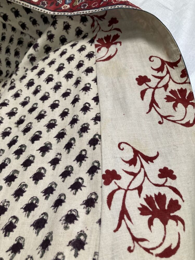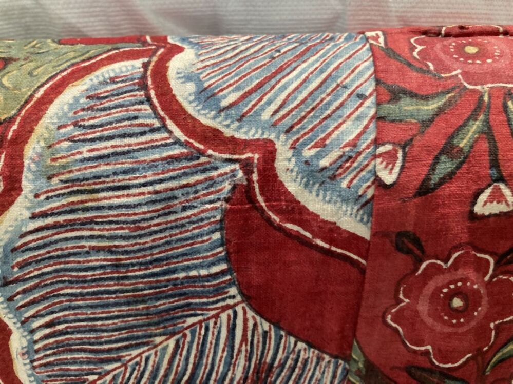 Japonse rok van Indiase sits in kimonovorm, beschilderd met prunus en pijnboommotief op rode grond, gevoerd met twee soorten eenvoudige bedrukte Indiase katoen