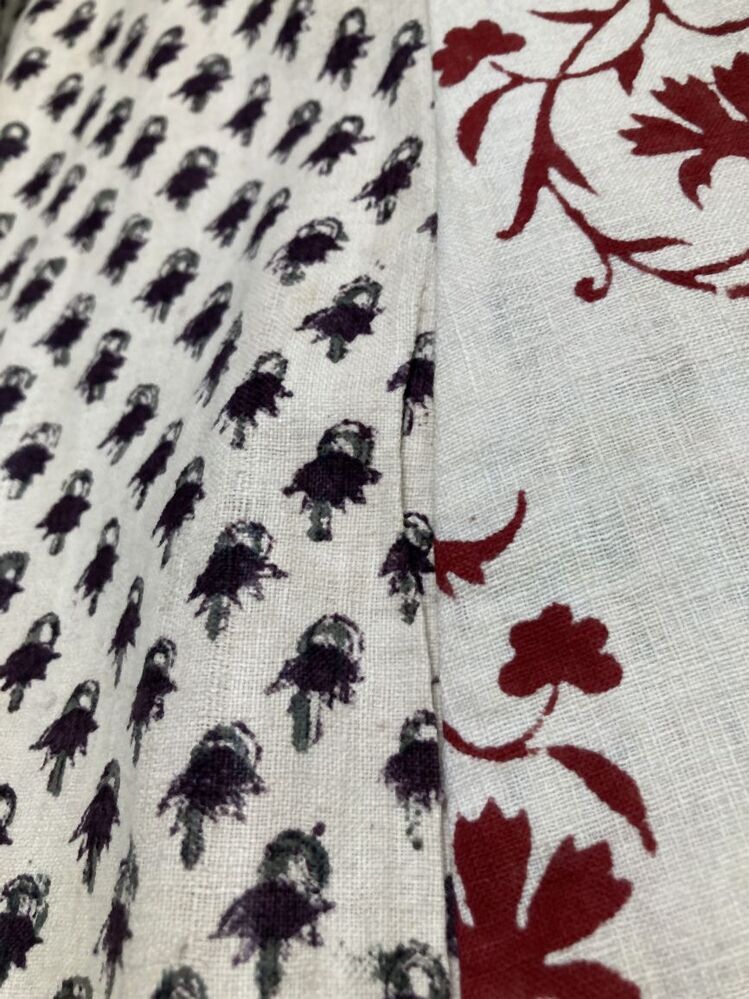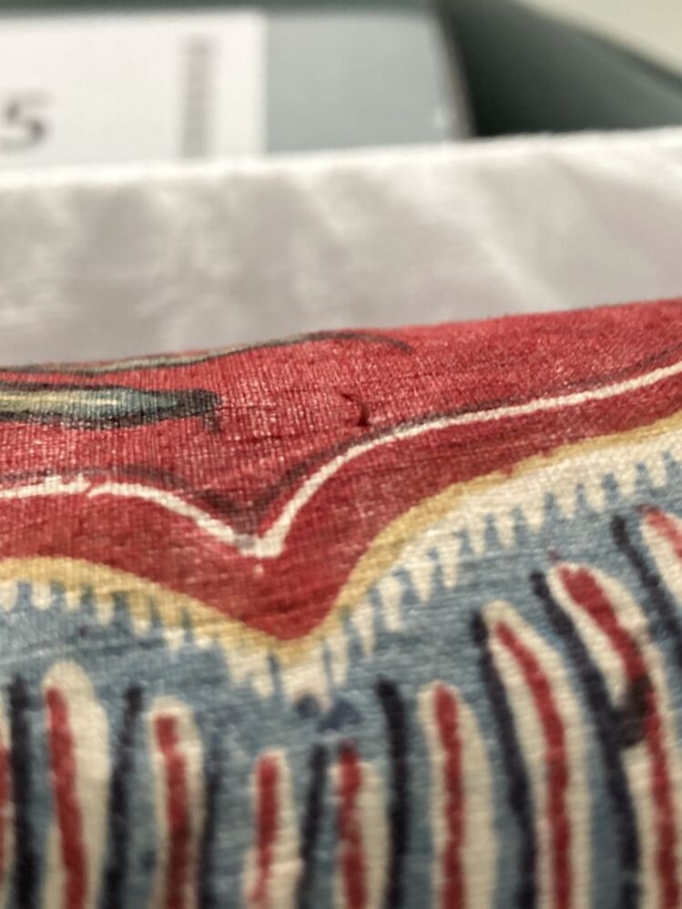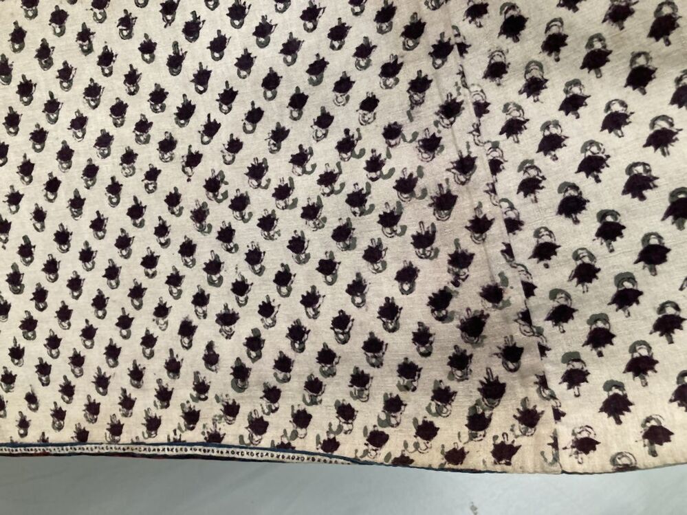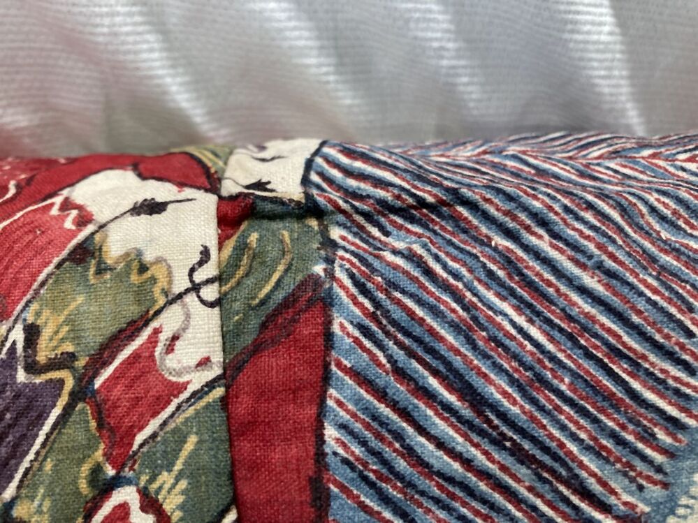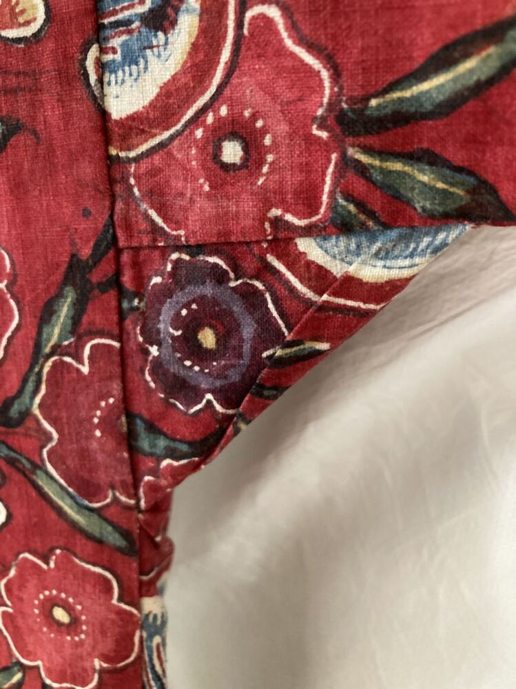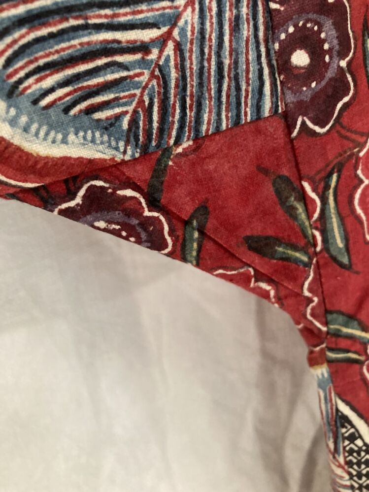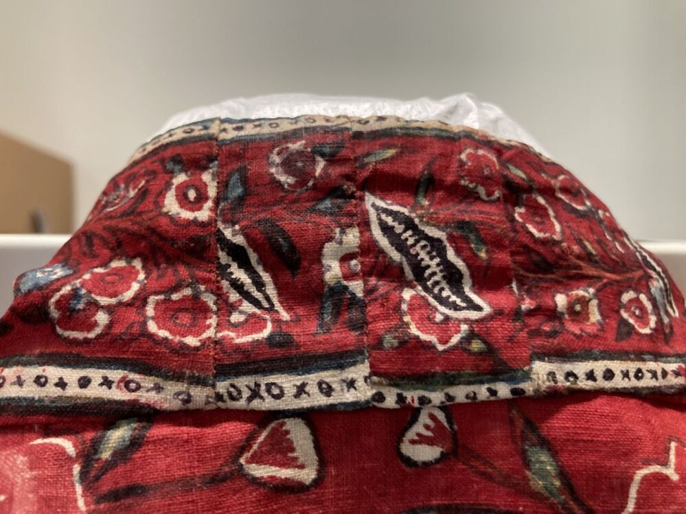 Japonse rok van Indiase sits in kimonovorm, beschilderd met prunus en pijnboommotief op rode grond, gevoerd met twee soorten eenvoudige bedrukte Indiase katoen