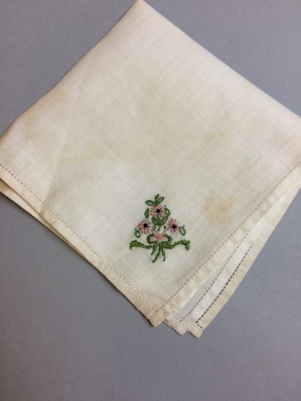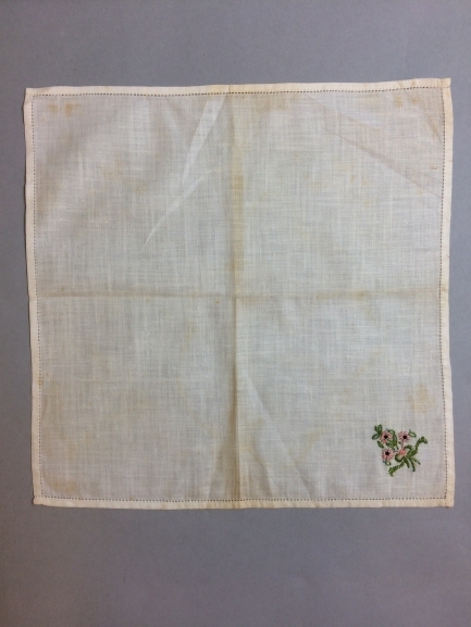 wit linnen batist zakdoekje met een geborduurd boeketje, volgens overlevering van Margaretha Zelle (Mata Hari)