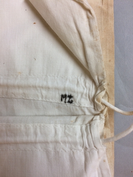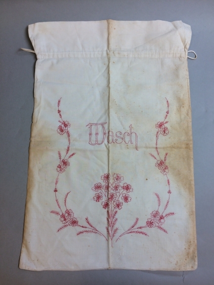Wit katoenen waszak met rood borduurwerk, afkomstig van Margaretha Zelle (Mata Hari)