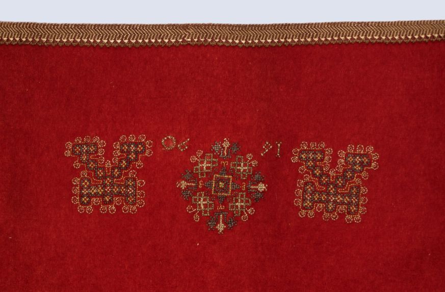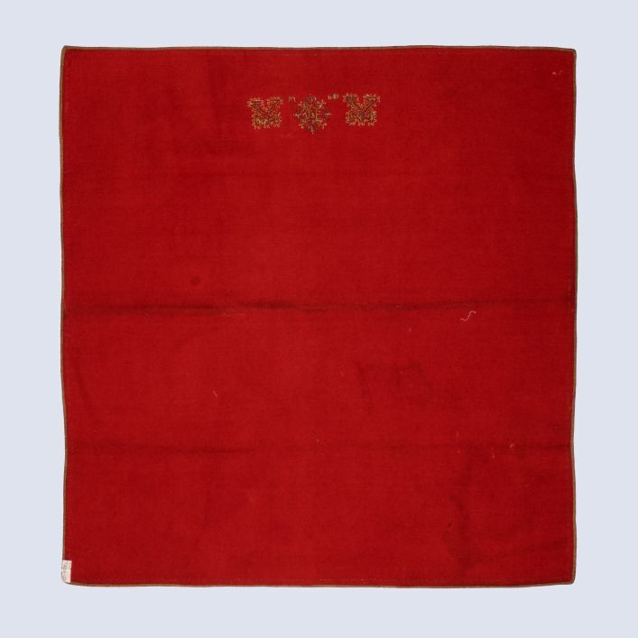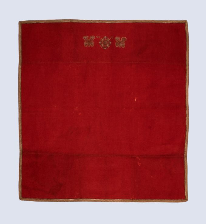 Rode pakluier van wollen laken, omzoomd met zijden galon, met initialen A A 1690 in gekleurde zijden kruissteken