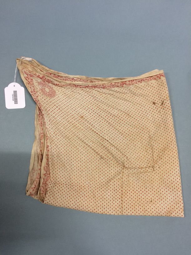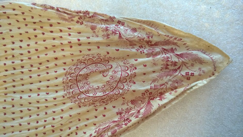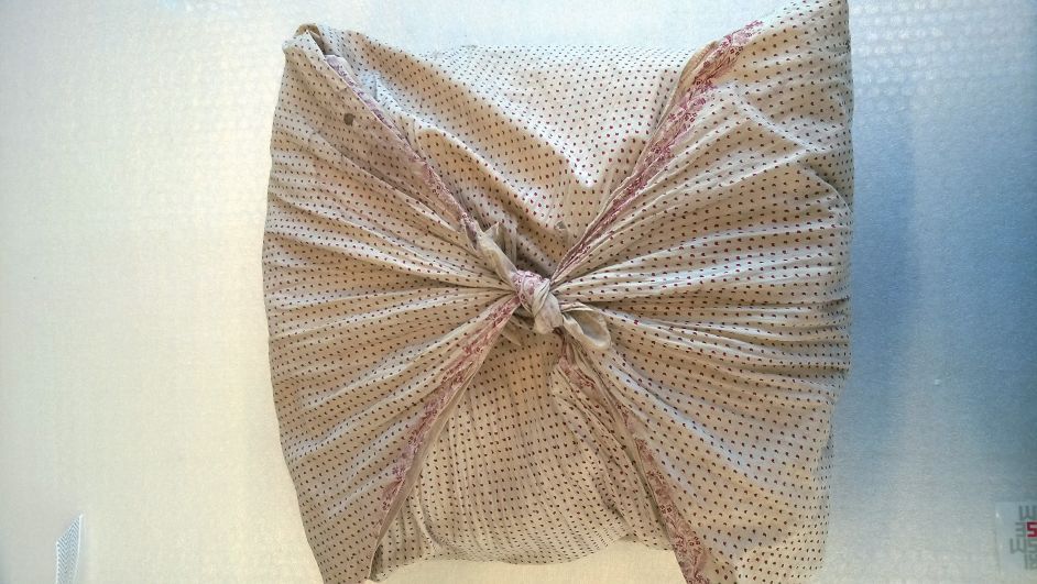 Wit met rood bedrukt katoenen doek waarin collectie kleding bewaard is gebleven