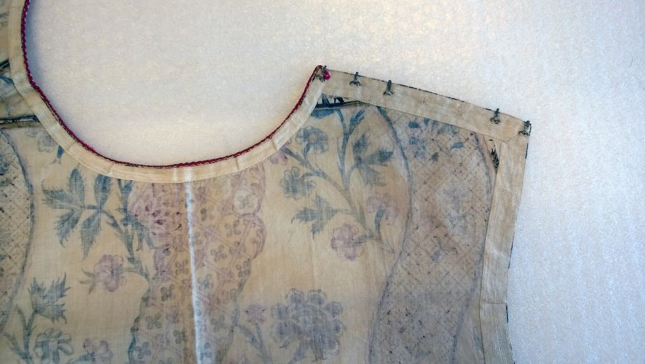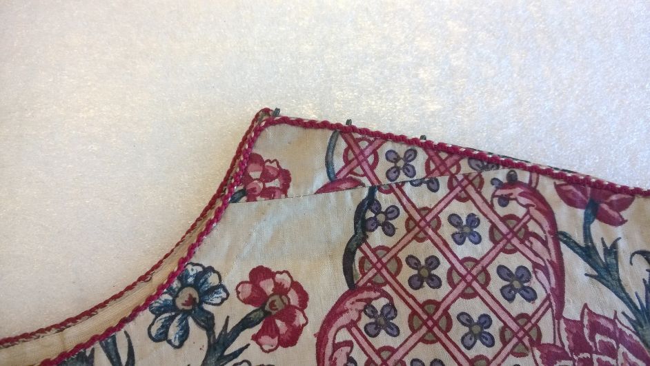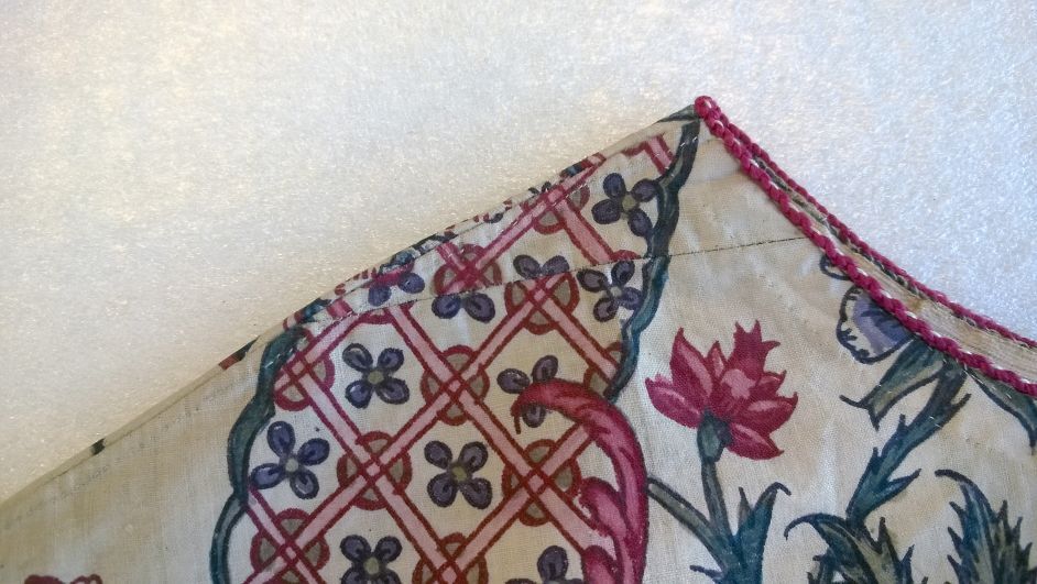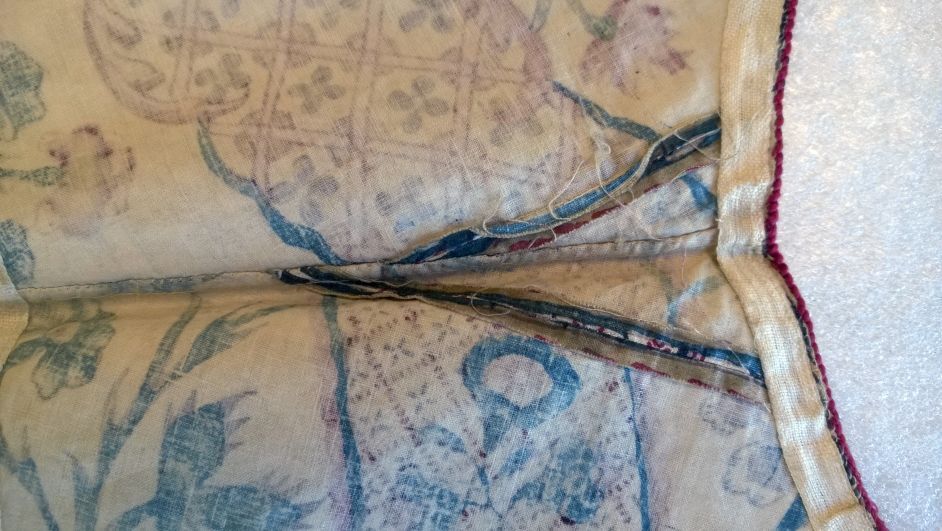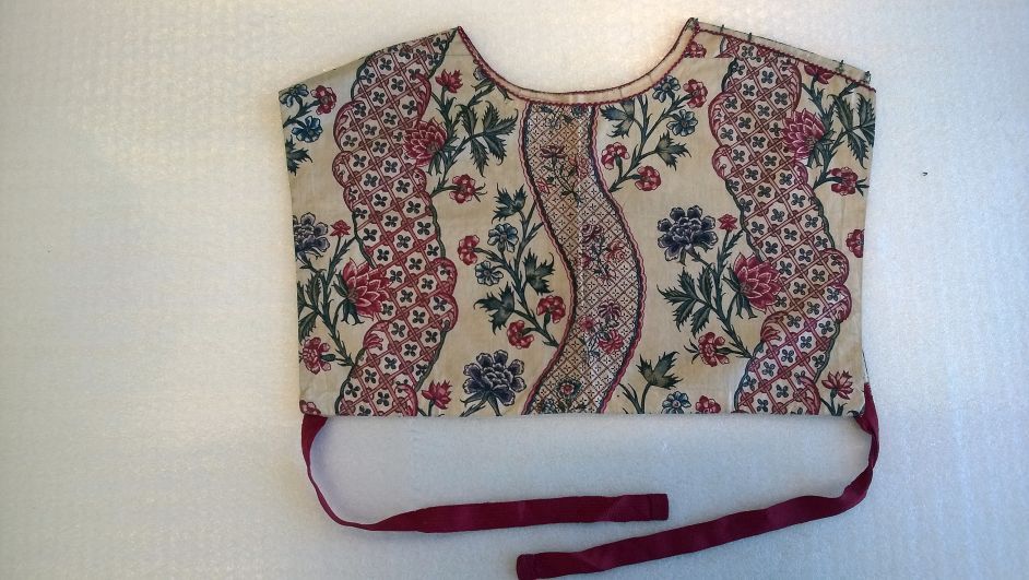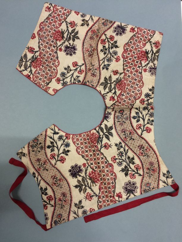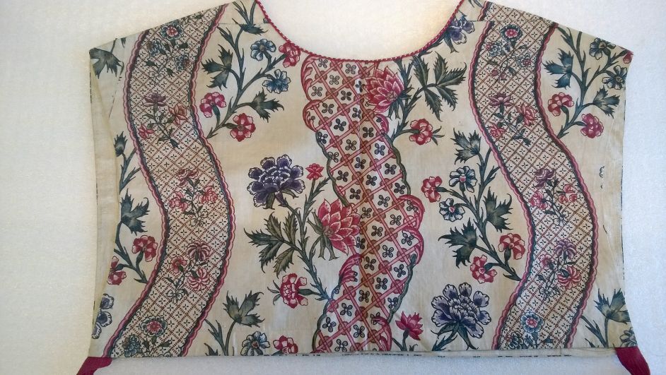 Kroplap of onderst van Indiase sits met een patroon van golvende banden met toefjes bloemen op witte grond, met rode zijden strikbanden