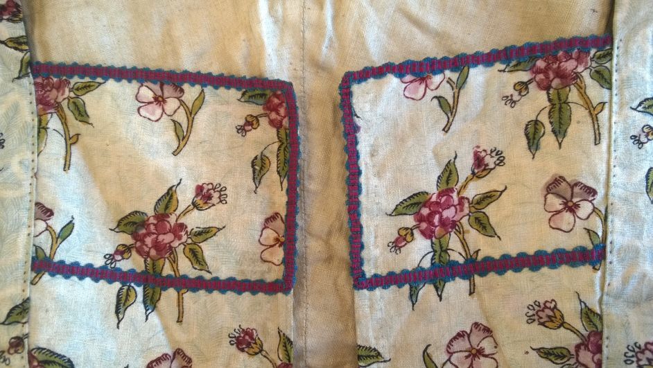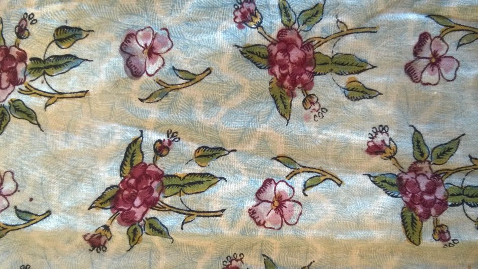 Vrouwenjak of caraco van bedrukt katoen met losse bloemen op witte grond met lichtblauwe veertjes