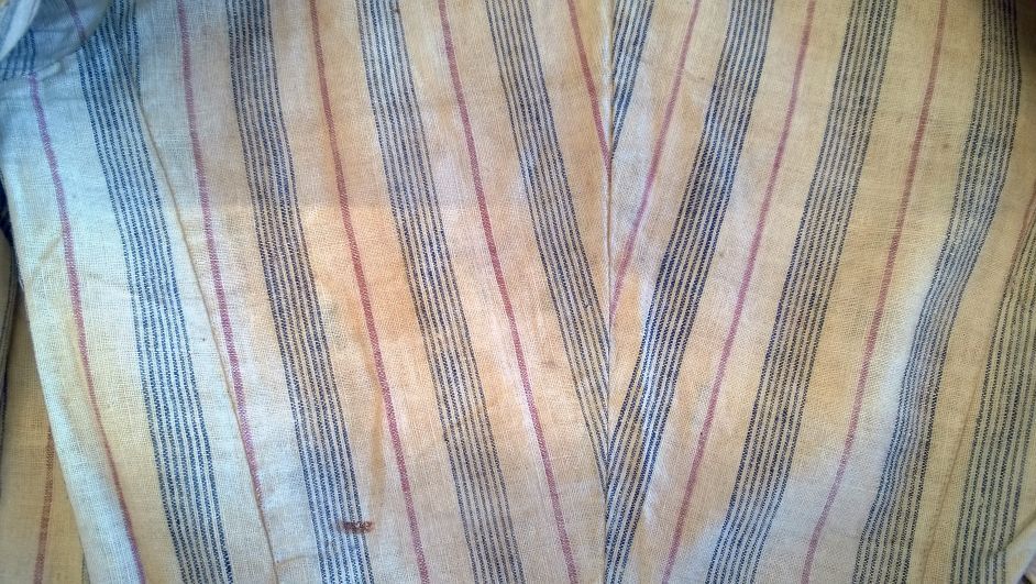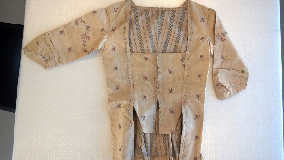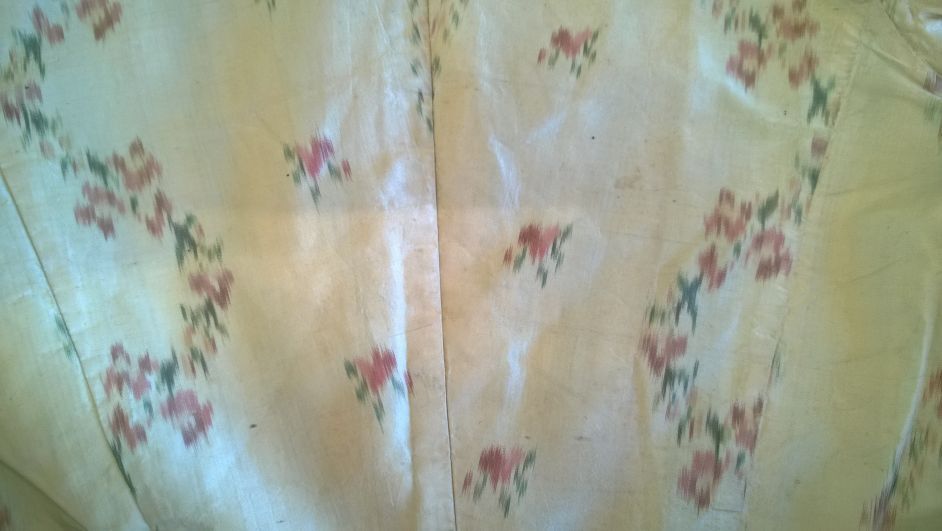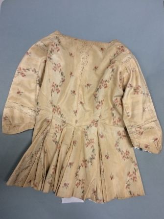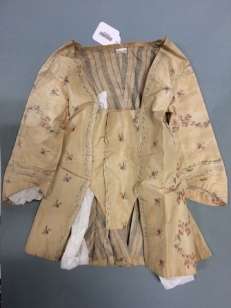 Vrouwenjak of caraco van creme taftzijde met chiné strepen