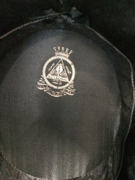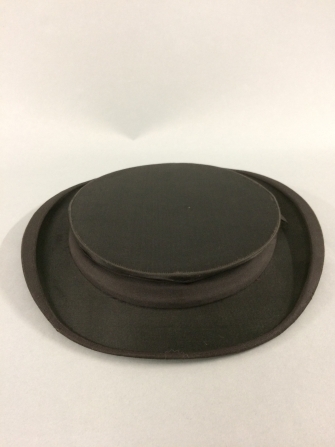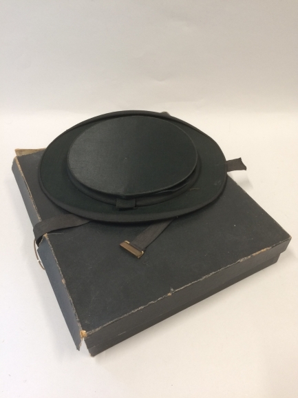 Zwarte hoge hoed die uitgeklapt kan worden middels scharnieren in de hoed, opgeborgen in bijbehorende zwarte doos