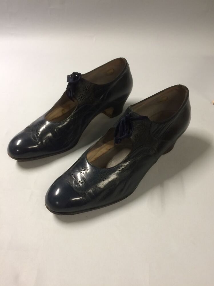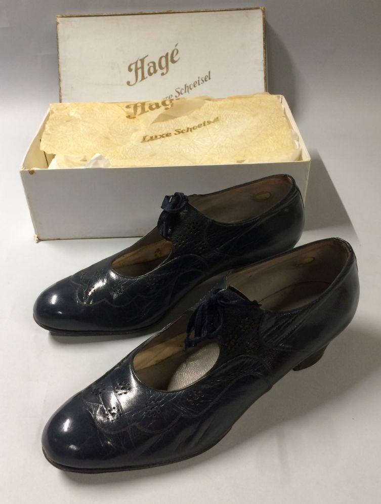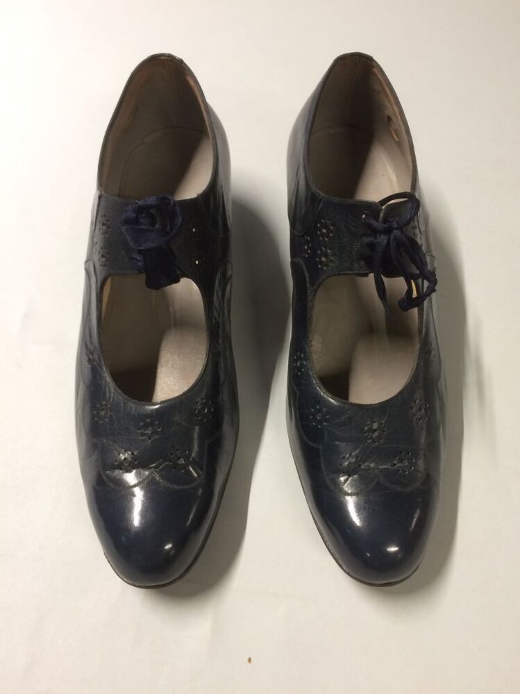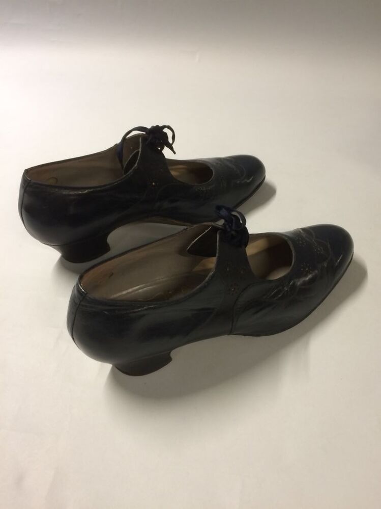 Paar donkerblauwe leren damesschoenen met hakje en wreefband met veter