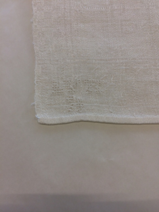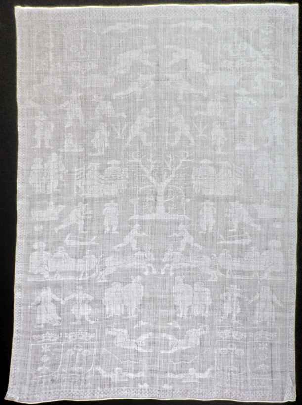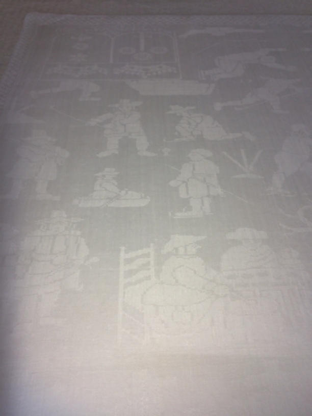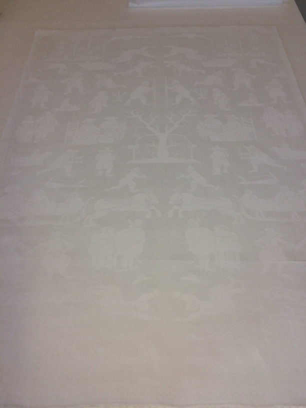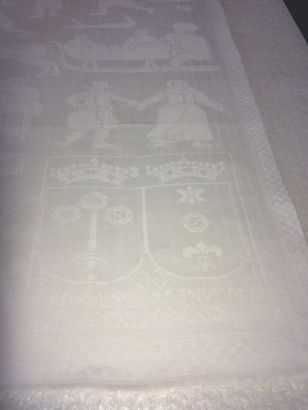 Servet met voorstelling van ijsvermaak en wapens en namen van Douwe van Aylva en Lucia van Meckema