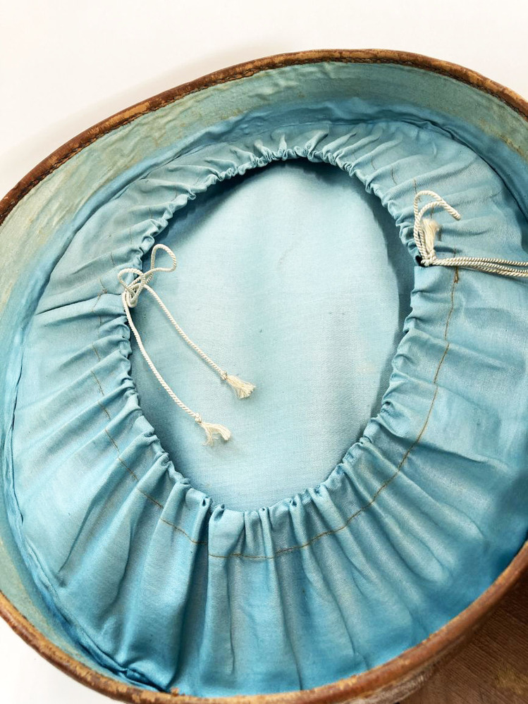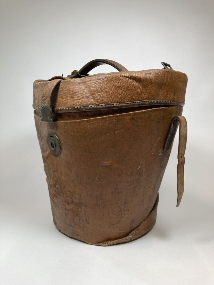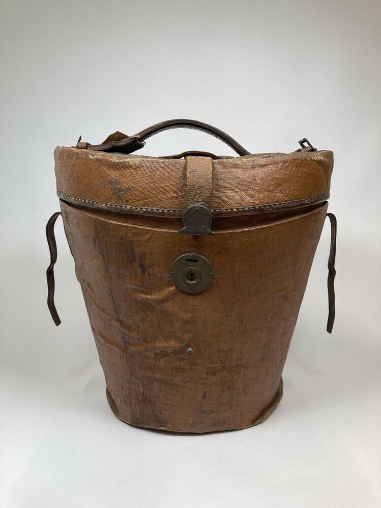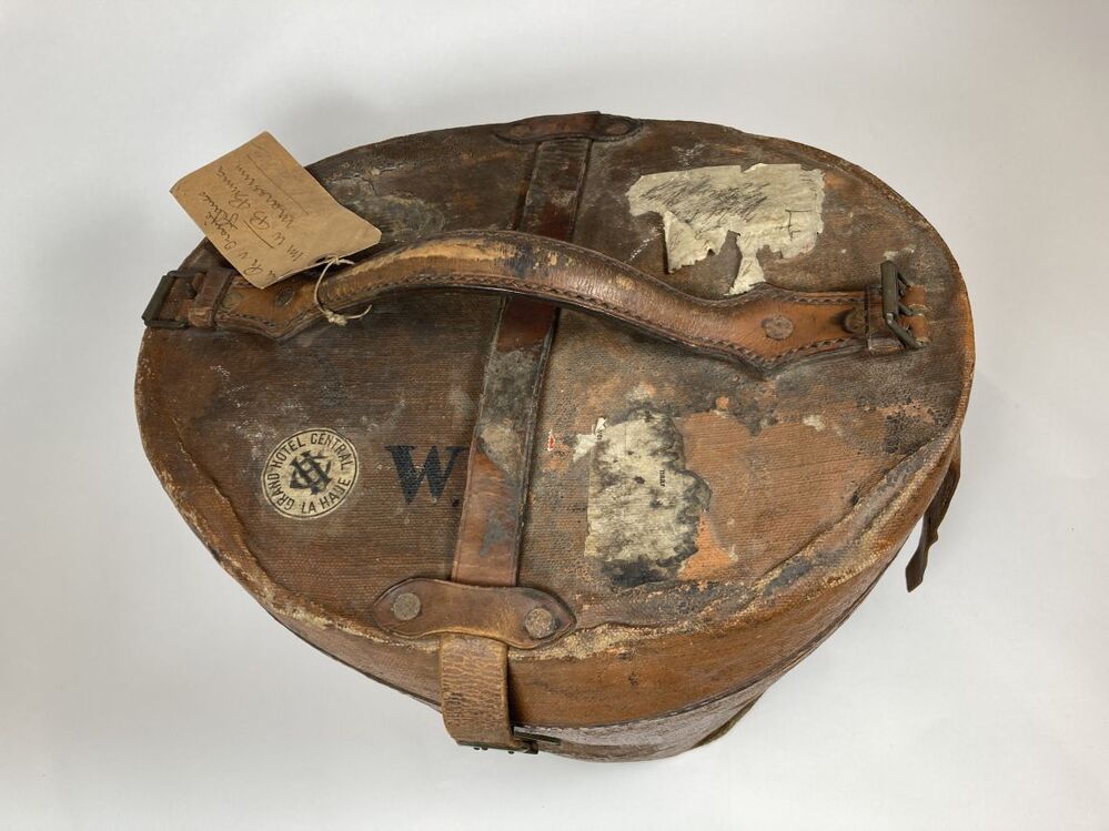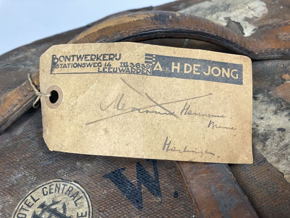 Bruine hoedenkoffer met blauwe voering en met aangehecht etiket van Bontwerkerij A. en H. de Jong Leeuwarden