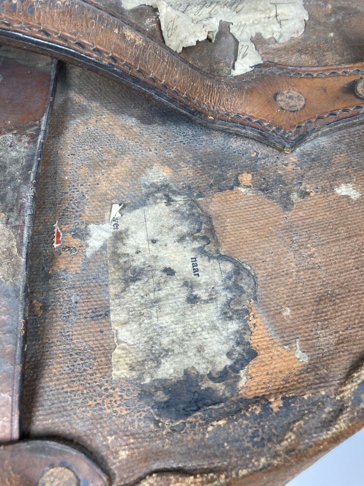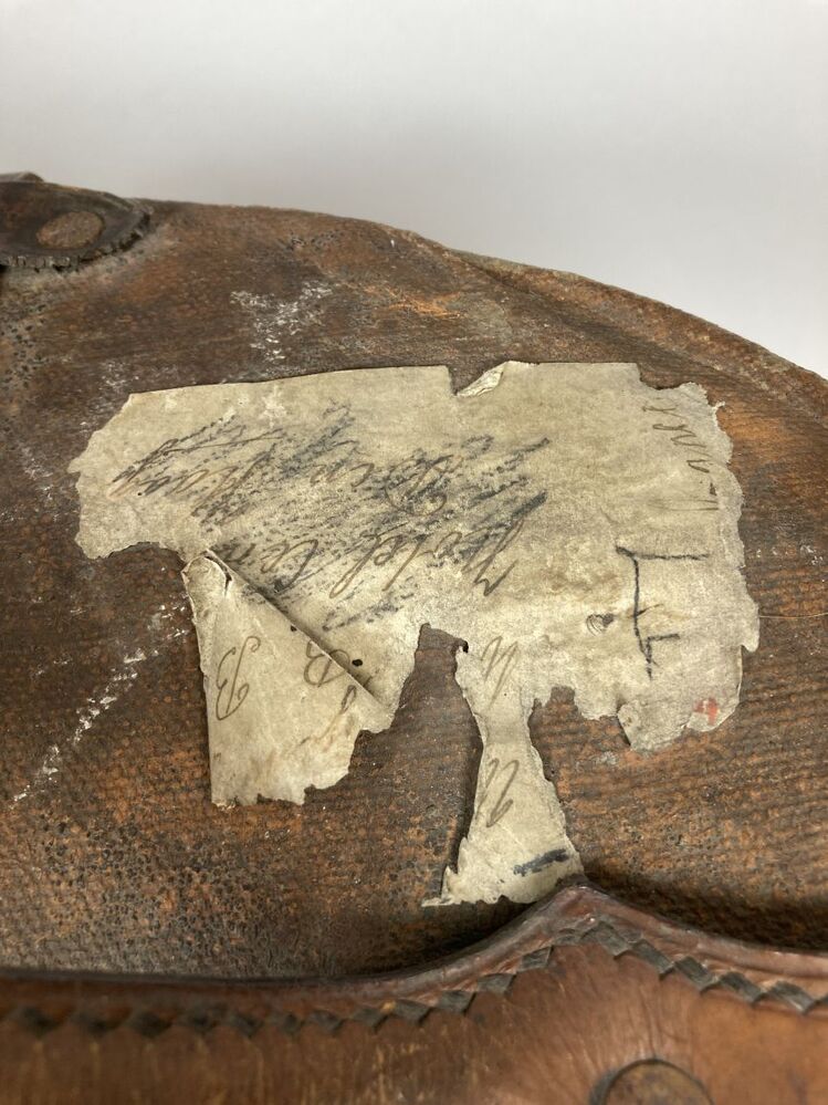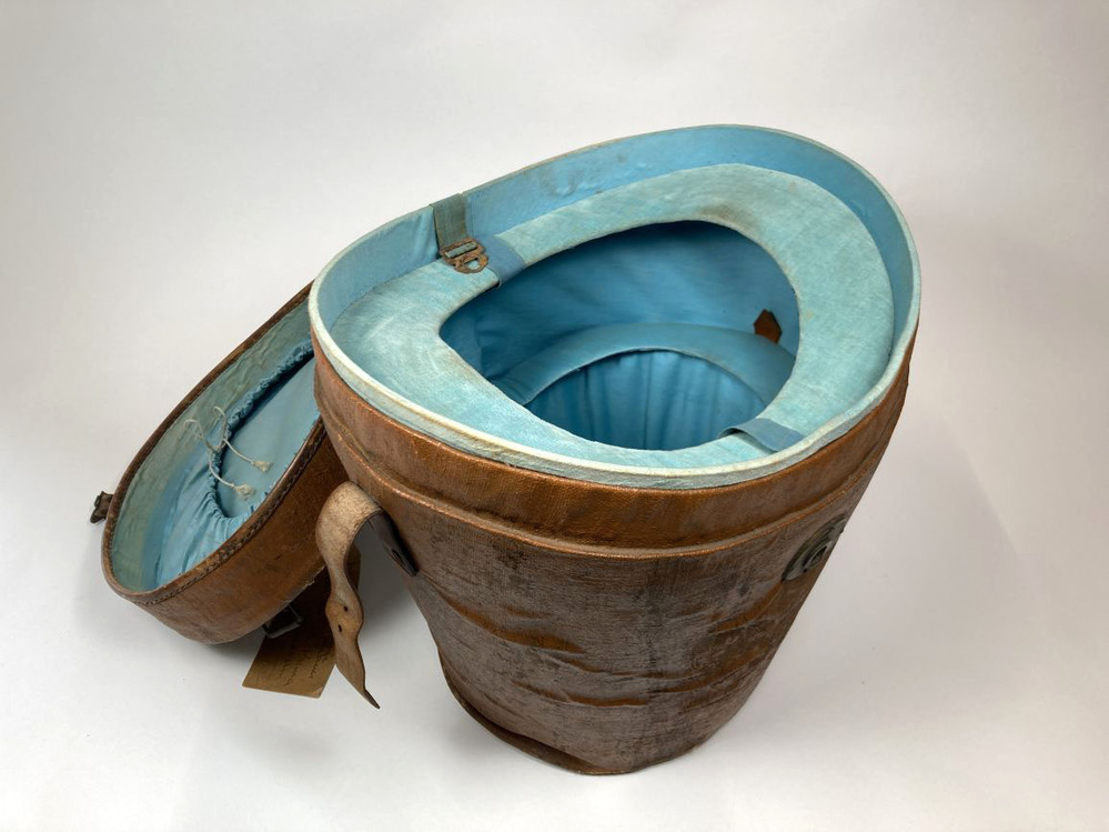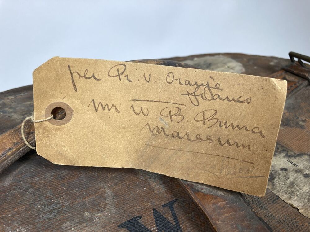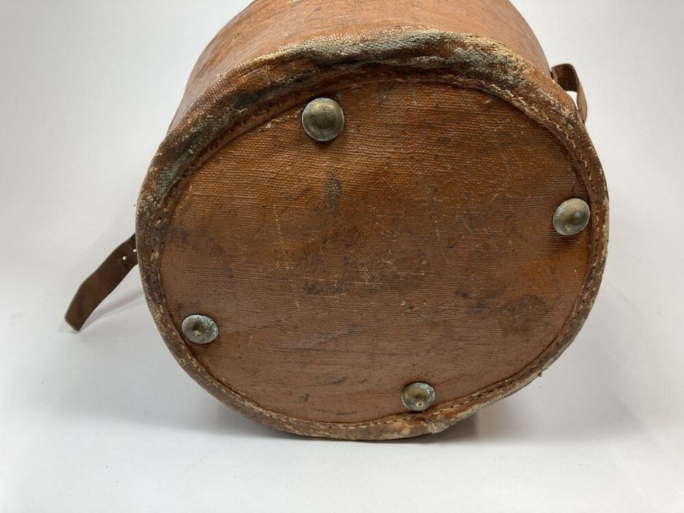 Bruine hoedenkoffer met blauwe voering en met aangehecht etiket van Bontwerkerij A. en H. de Jong Leeuwarden