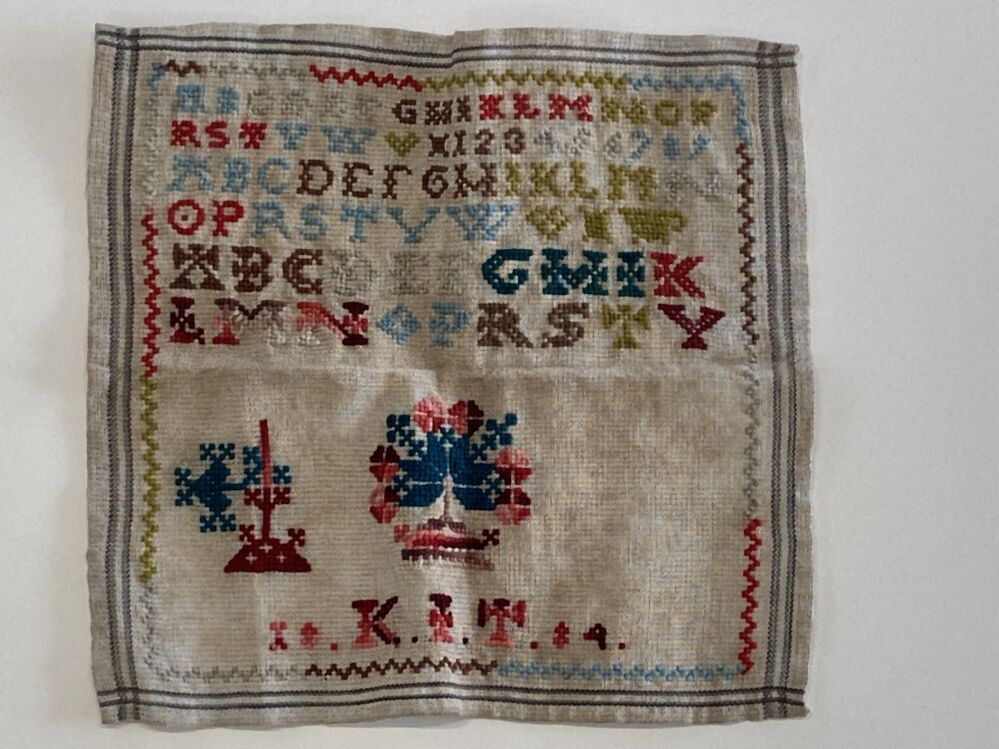 Letterlap op stramien, met wol geborduurd