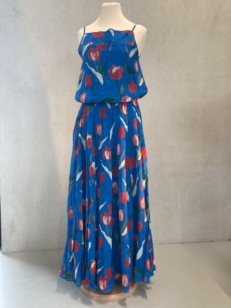 Maxi-jurk van Frank Govers, zomerjurk bedrukt met rode tulpen op blauwe grond