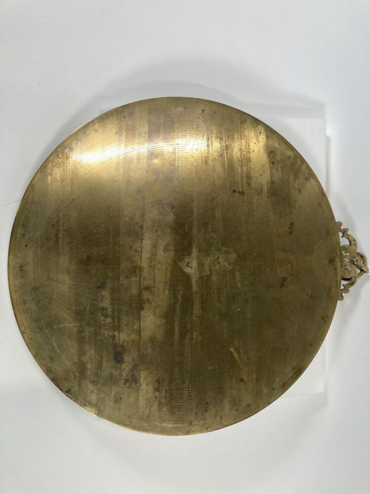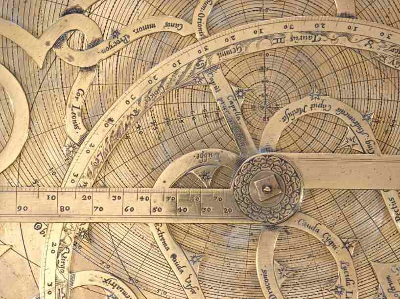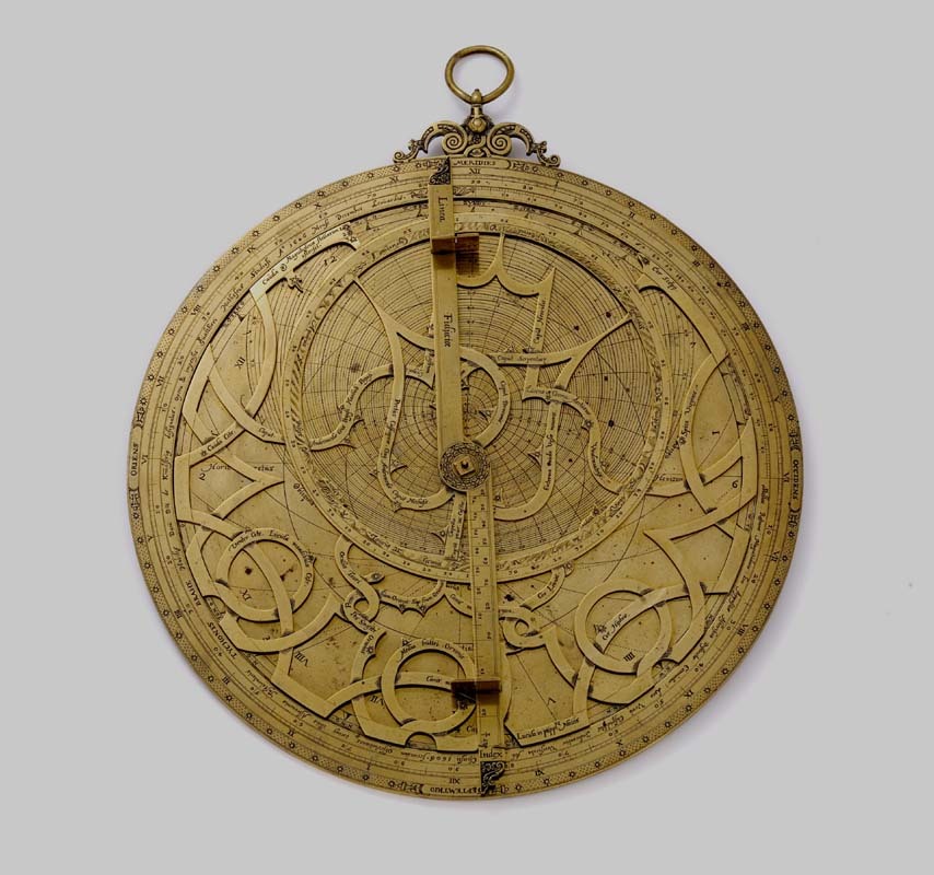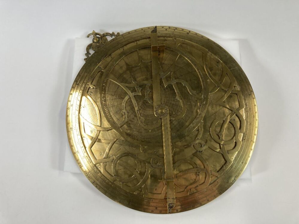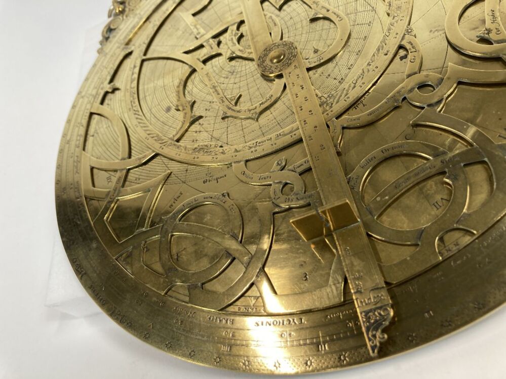 Koperen astrolabium waarop een opschrift in Latijn