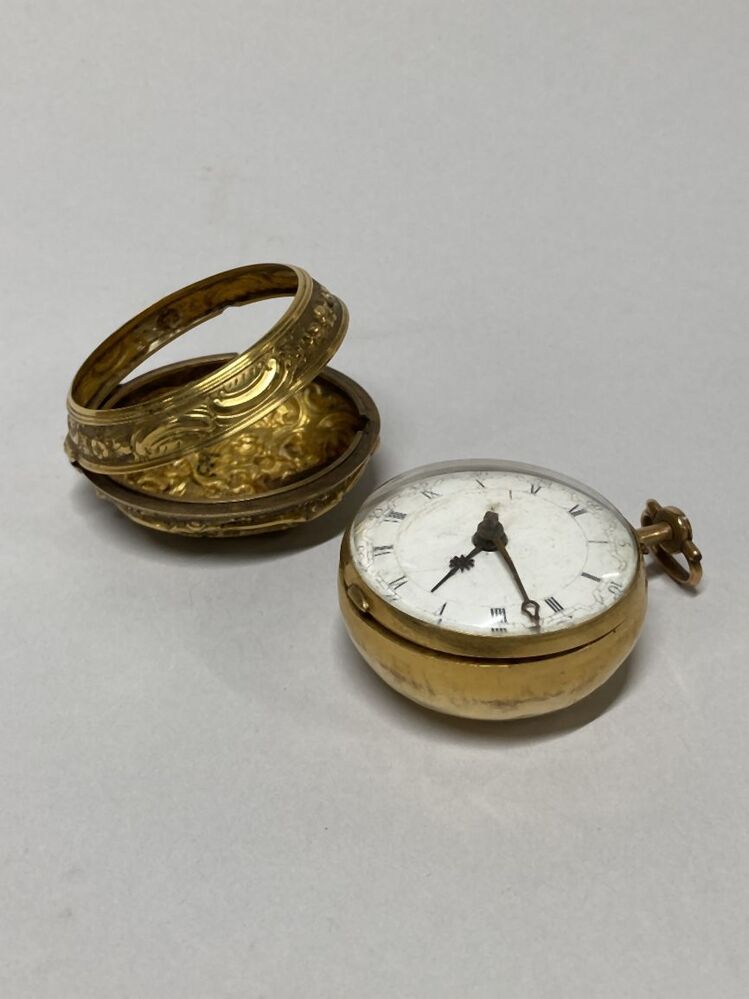 Afgeplat bolvormig horloge, wit geëmailleerde wijzerplaat met losse kast