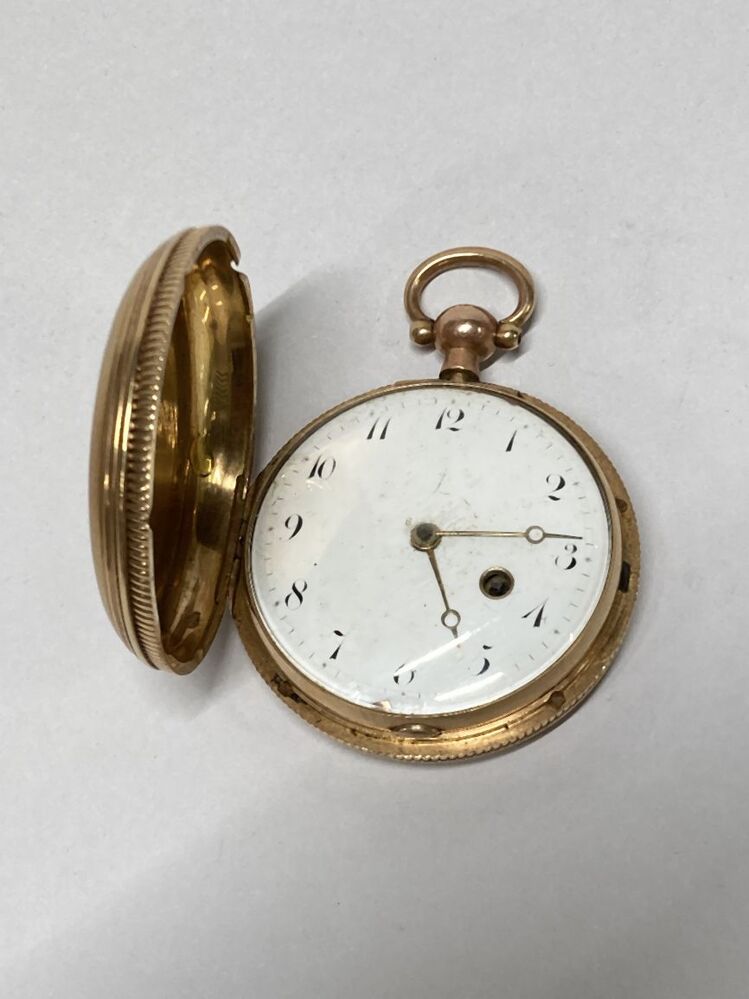 Rond horloge met wit geëmailleerde wijzerplaat, waarop tijdaanduiding in zwarte Arabische cijfers