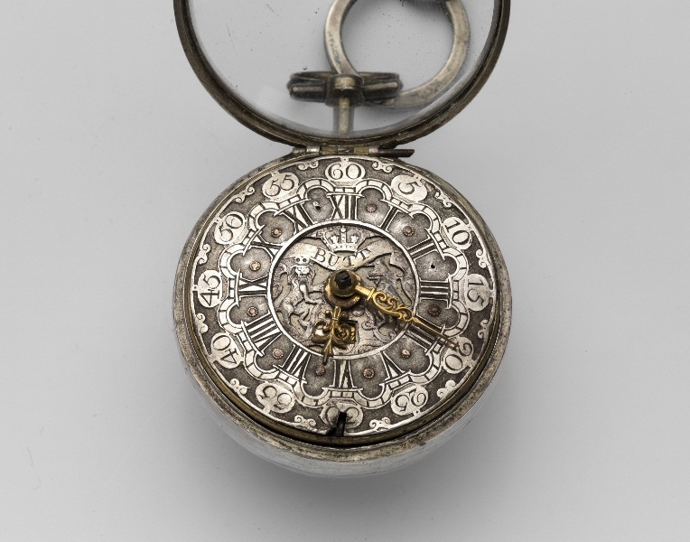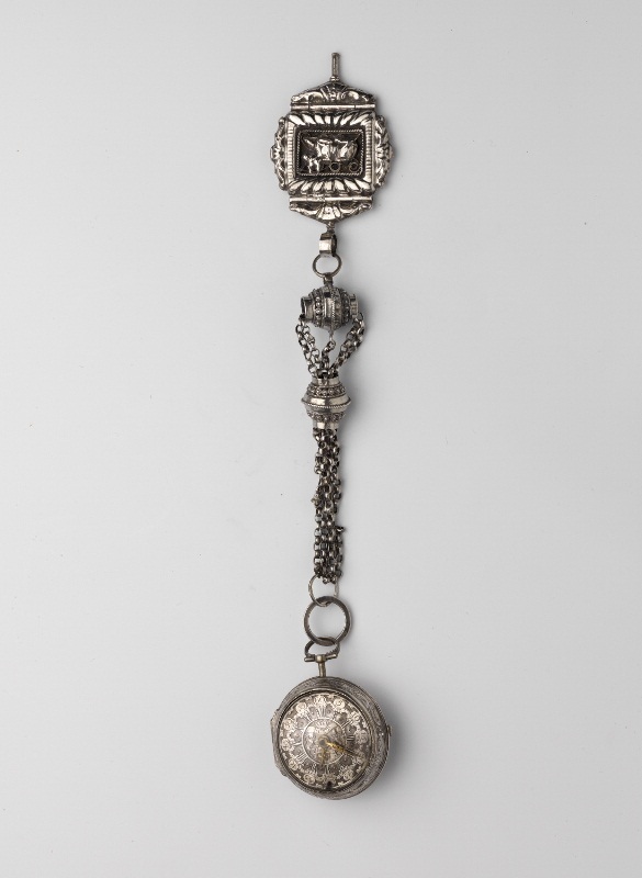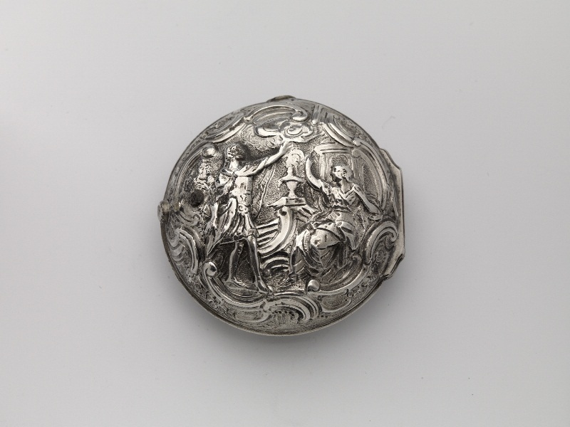 Zilveren horloge met losse buitenkant waarop een mythologische voorstelling